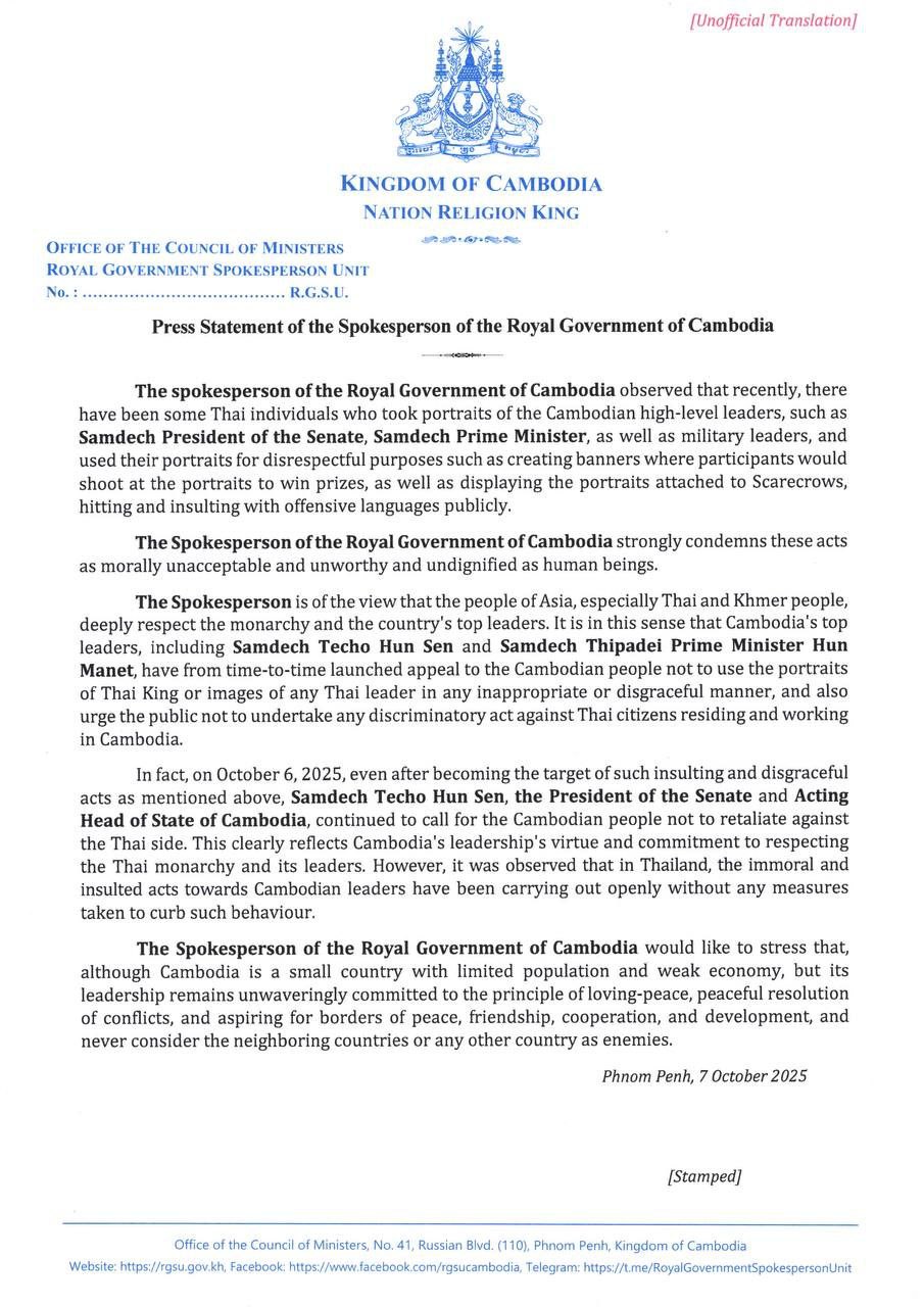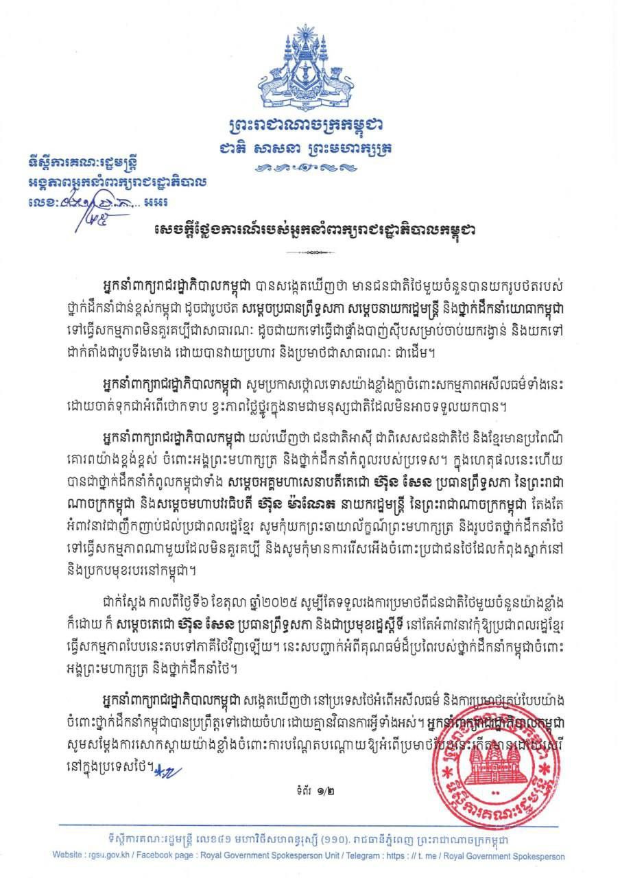 យោងតាមសេចក្តីថ្លែងការណ៍របស់អ្នកនាំពាក្យរាជរដ្ឋាភិបាលកម្ពុជា នៅថ្ងៃទី៧ ខែតុលា ឆ្នាំ២០២៥ បានឱ្យដឹងថា មានជនជាតិថៃមួយចំនួនបានយករូបថតរបស់ថ្នាក់ដឹកនាំជាន់ខ្ពស់កម្ពុជា ដូចជារូបថត សម្តេចប្រធានព្រឹទ្ធសភា សម្តេចនាយករដ្ឋមន្ត្រី និងថ្នាក់ដឹកនាំយោធាកម្ពុជាទៅធ្វើសកម្មភាពមិនគួរគប្បីជាសាធារណៈ ដូចជាយកទៅធ្វើជាផ្ទាំងបាញ់ស៊ីបសម្រាប់ចាប់យករង្វាន់ និងយកទៅដាក់តាំងជារូបទីងមោង ដោយបានវាយប្រហារ និងប្រមាថជាសាធារណៈ ជាដើម។ អ្នកនាំពាក្យរាជរដ្ឋាភិបាលកម្ពុជា សូមប្រកាសថ្កោលទោសយ៉ាងខ្លាំងក្លាចំពោះសកម្មភាពអសីលធម៌ទាំងនេះដោយចាត់ទុកជាអំពើថោកទាប ខ្វះភាពថ្លៃថ្នូរក្នុងនាមជាមនុស្សជាតិដែលមិនអាចទទួលយកបាន។