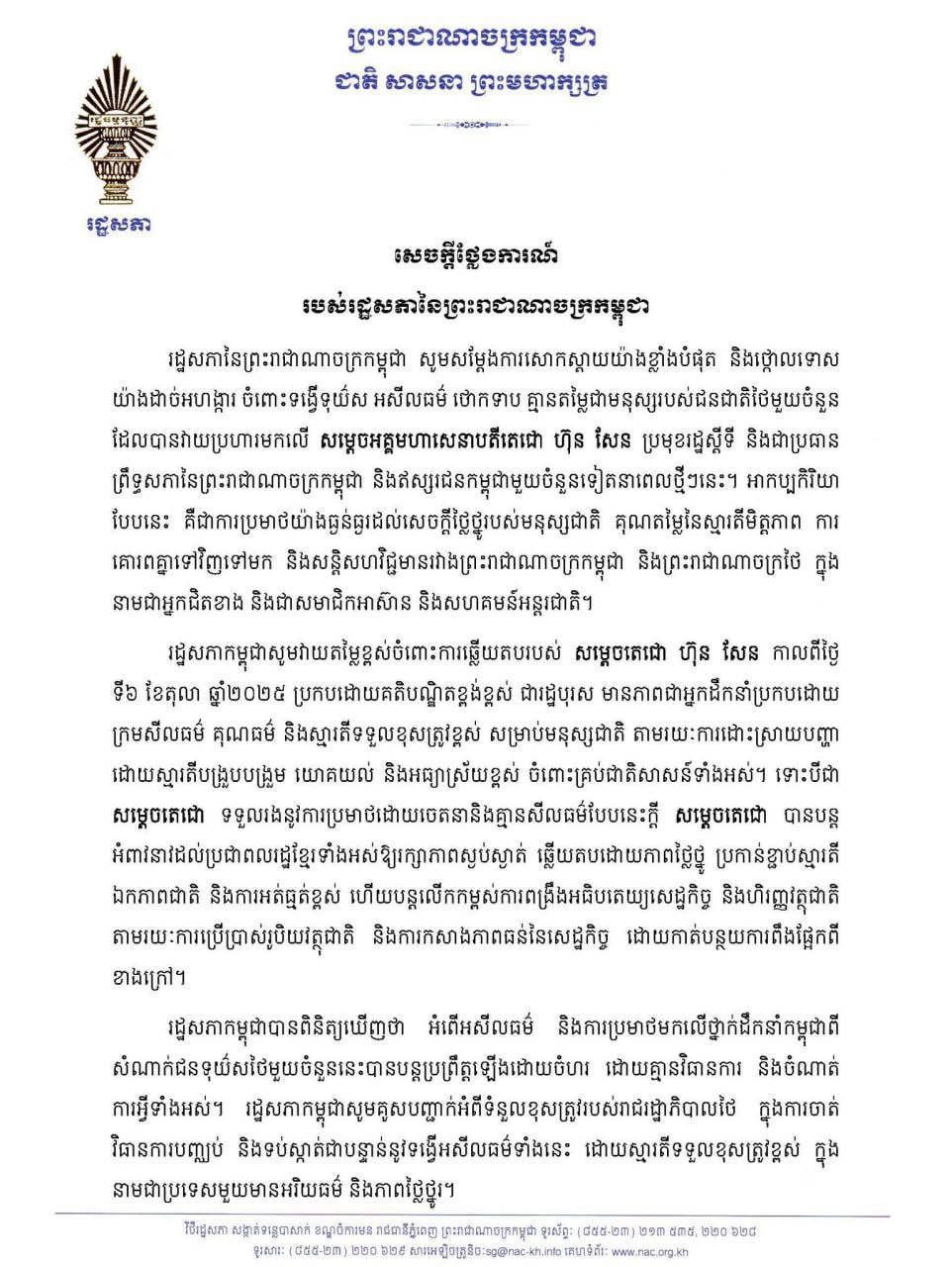 នៅថ្ងៃទី៨ ខែតុលា ឆ្នាំ២០២៥ រដ្ឋសភាកម្ពុជា បានចេញសេចក្តីថ្លែងការណ៍សម្ដែងការសោកស្តាយយ៉ាងខ្លាំងបំផុត និងថ្កោលទោសយ៉ាងដាច់អហង្ការ ទង្វើទុយ៌ស អសីលធម៌ ថោកទាប គ្មានតម្លៃជាមនុស្សរបស់ជនជាតិថៃមួយចំនួនដែលបានវាយប្រហារមកលើ សម្តេចអគ្គមហាសេនាបតីតេជោ ហ៊ុន សែន ប្រមុខរដ្ឋស្តីទី និងជាប្រធានព្រឹទ្ធសភានៃព្រះរាជាណាចក្រកម្ពុជា និងឥស្សរជនកម្ពុជាមួយចំនួនទៀតនាពេលថ្មីៗនេះ។