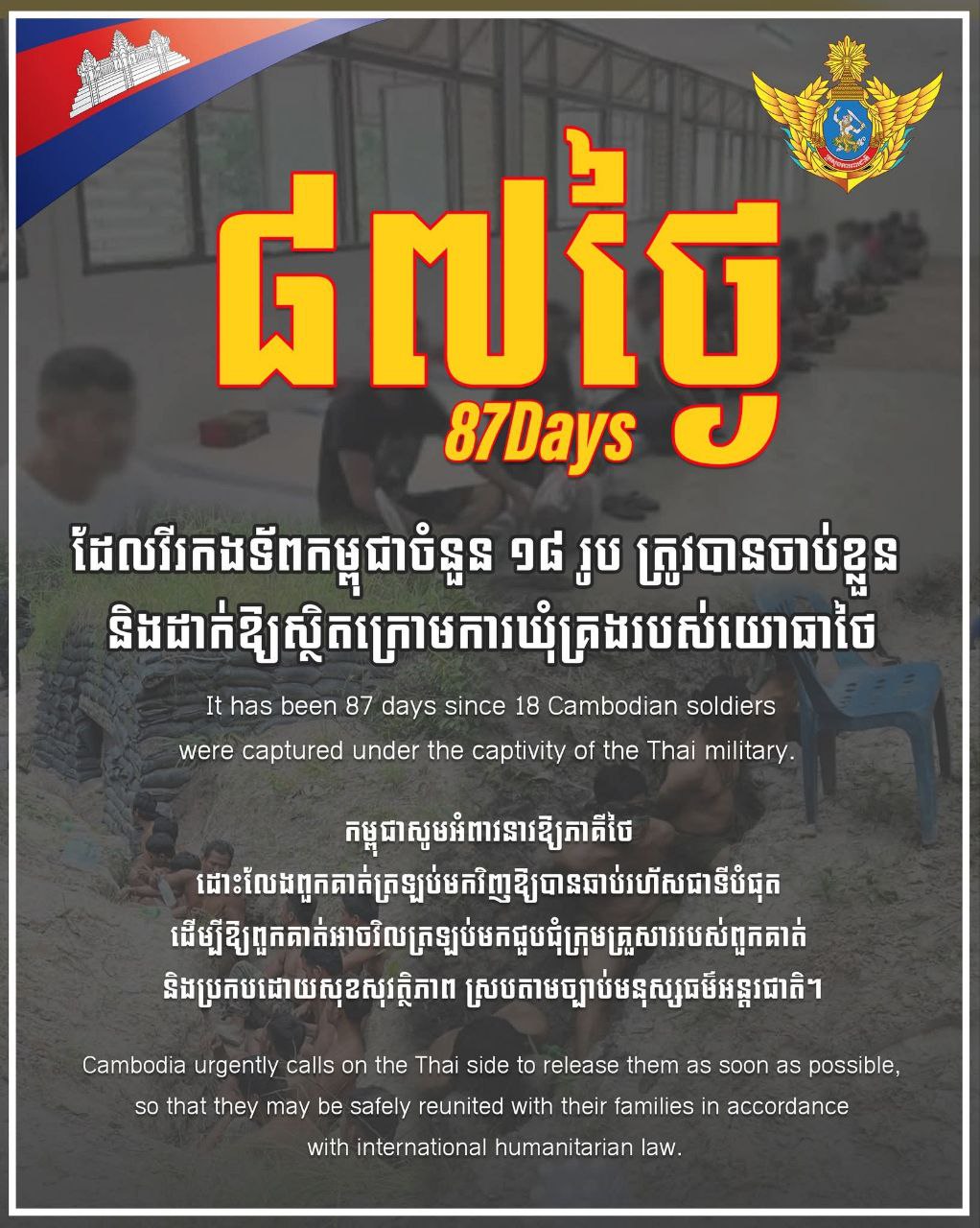 It has been 87days since 18 Cambodian soldiers were captured under the captivity of the Thai military. Cambodia urgently calls on the Thai side to release them as soon as possible, so that they may be safely reunited with their families in accordance with international humanitarian law.