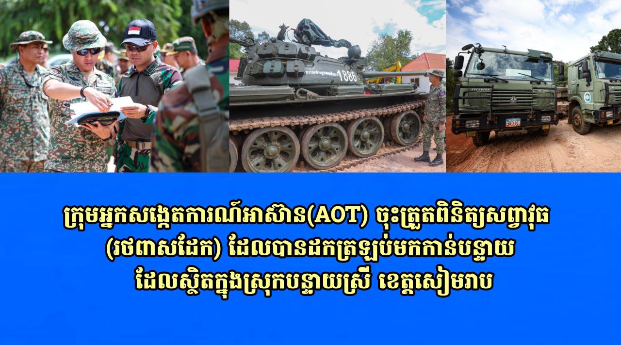 ក្រុមអ្នកសង្កេតការណ៍អាស៊ាន(AOT) ចុះត្រួតពិនិត្យសព្វាវុធ (រថពាសដែក) ដែលបានដកត្រឡប់មកកាន់បន្ទាយ ដែលស្ថិតក្នុងស្រុកបន្ទាយស្រី ខេត្តសៀមរាប