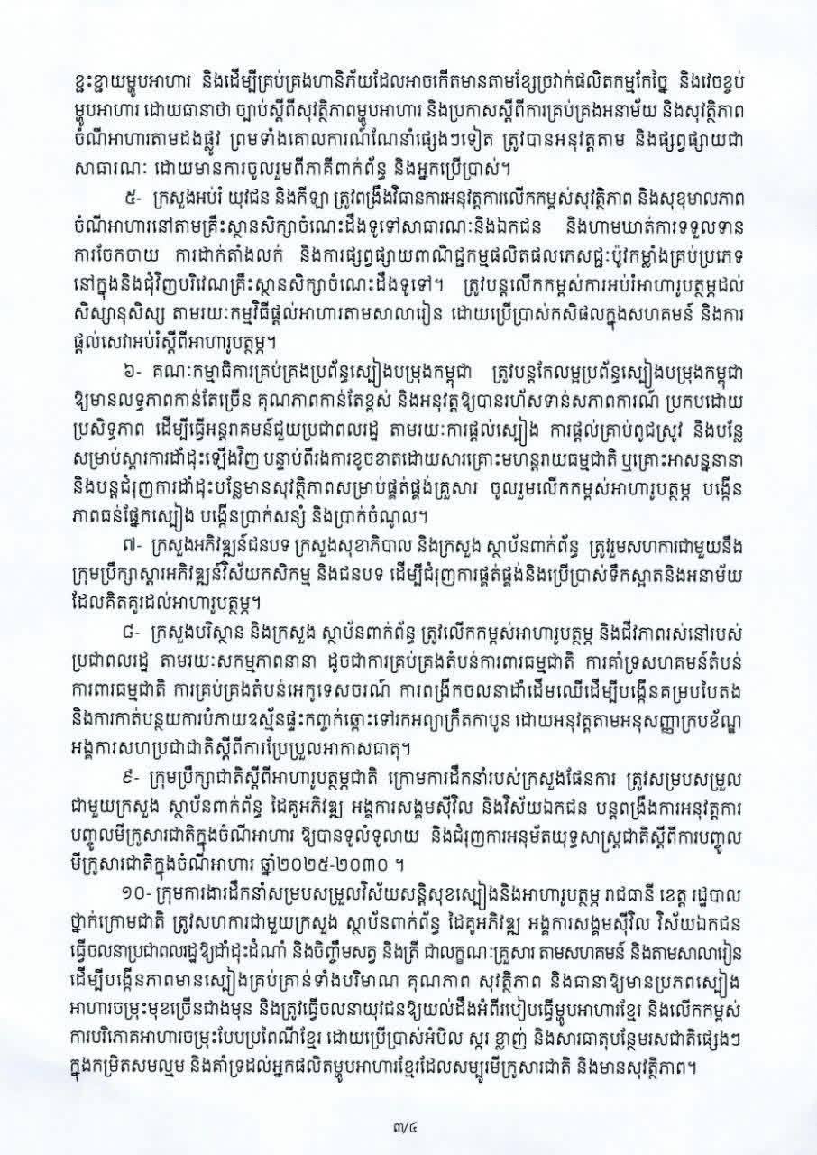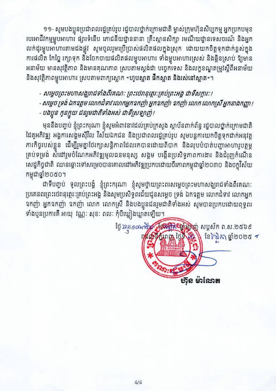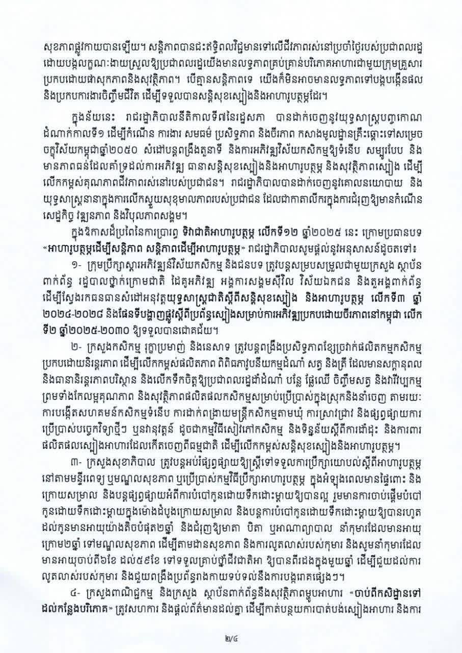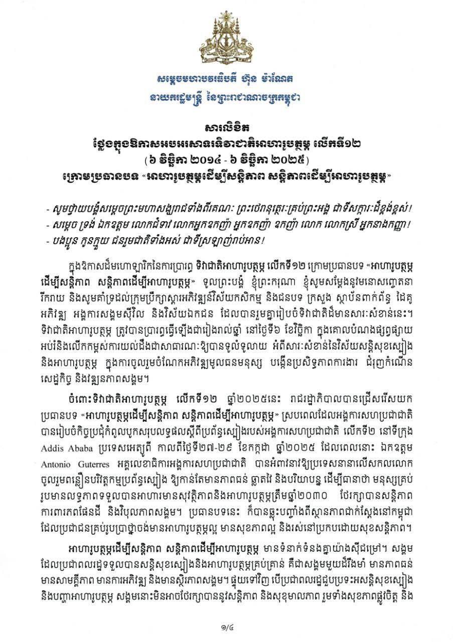 យោងតាមសារលិខិតអបអរសាទរទិវាជាតិអាហារូបត្ថម្ភ លើកទី១២ (៦ វិច្ឆិកា ២០១៤ – ៦ វិច្ឆិកា ២០២៥) ក្រោមប្រធានបទ «អាហារូបត្ថម្ភដើម្បីសន្តិភាព សន្តិភាពដើម្បីអាហារូបត្ថម្ភ» សម្តេចធិបតី ហ៊ុន ម៉ាណែត បានគូសបញ្ជាក់ថា រាជរដ្ឋាភិបាលបានជ្រើសរើសប្រធានបទខាងលើនេះស្របពេលដែលអង្គការសហប្រជាជាតិ បានរៀបចំកិច្ចប្រជុំកំពូលបូកសរុបលទ្ធផលស្តីពីប្រព័ន្ធស្បៀងរបស់អង្គការសហប្រជាជាតិលើកទី២ នៅទីក្រុង Addis Ababa ប្រទេសអេត្យូពី កាលពីថ្ងៃទី២៧-២៩ ខែកក្កដា ឆ្នាំ២០២៥ ដែលពេលនោះ ឯកឧត្តម Antonio Guterres អគ្គលេខាធិការអង្គការសហប្រជាជាតិ បានអំពាវនាវឱ្យប្រទេសនានាលើសកលលោកចូលរួមពន្លឿន បរិវត្តកម្មប្រព័ន្ធស្បៀងឱ្យកាន់តែមានភាពធន់ ឆ្លាតវៃនិងបរិយាបន្នដើម្បីធានាថា មនុស្សគ្រប់រូបមានលទ្ធភាពទ ទួលបានអាហារមានសុវត្ថិភាព និងអាហារូបត្ថម្ភត្រឹមឆ្នាំ២០៣០ ថែរក្សាបានសន្តិភាព ការពារភពផែនដីនិងវិបុ លភាពសង្គម។