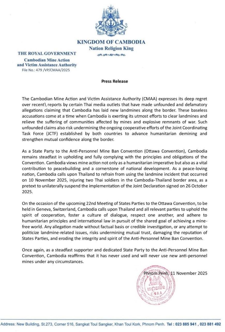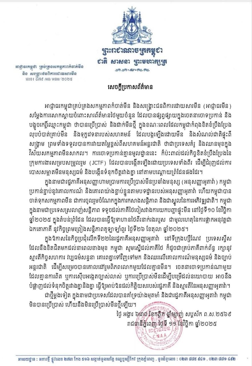 យោងតាមសេចក្តីប្រកាសព័ត៌មានចុះថ្ងៃទី១១ ខែវិច្ឆិកាឆ្នាំ២០២៥ អាជ្ញាធរកម្ពុជាគ្រប់គ្រងសកម្មភាពកំចាត់មីន និងសង្គ្រោះជនពិការដោយសារមីន (អាជ្ញាធរមីន) បានសម្តែងការសោកស្តាយចំពោះសារព័ត៌មានថៃមួយចំនួន ដែលបានផ្សព្វផ្សាយក្នុងចេតនាចោទប្រកាន់និងបង្ខូចកេរ្តិ៍ឈ្មោះកម្ពុជា ថាបានប្រើប្រាស់និងដាក់មីនថ្មីក្នុងខណៈពេលដែលកម្ពុជាកំពុងខិតខំប្រឹងប្រែងលុបបំបាត់គ្រាប់មីននិងទុក្ខវេទនារបស់សហគមន៍ដែលបង្កឡើងដោយមីននិងសំណល់ជាតិផ្ទុះពីសង្គ្រាមព្រមទាំងទទួលបានការវាយតម្លៃខ្ពស់ពីសហគមន៍អន្តរជាតិថាជាប្រទេសគំរូនិងឈានមុខក្នុងវិស័យសកម្មភាពមីនសាកល។