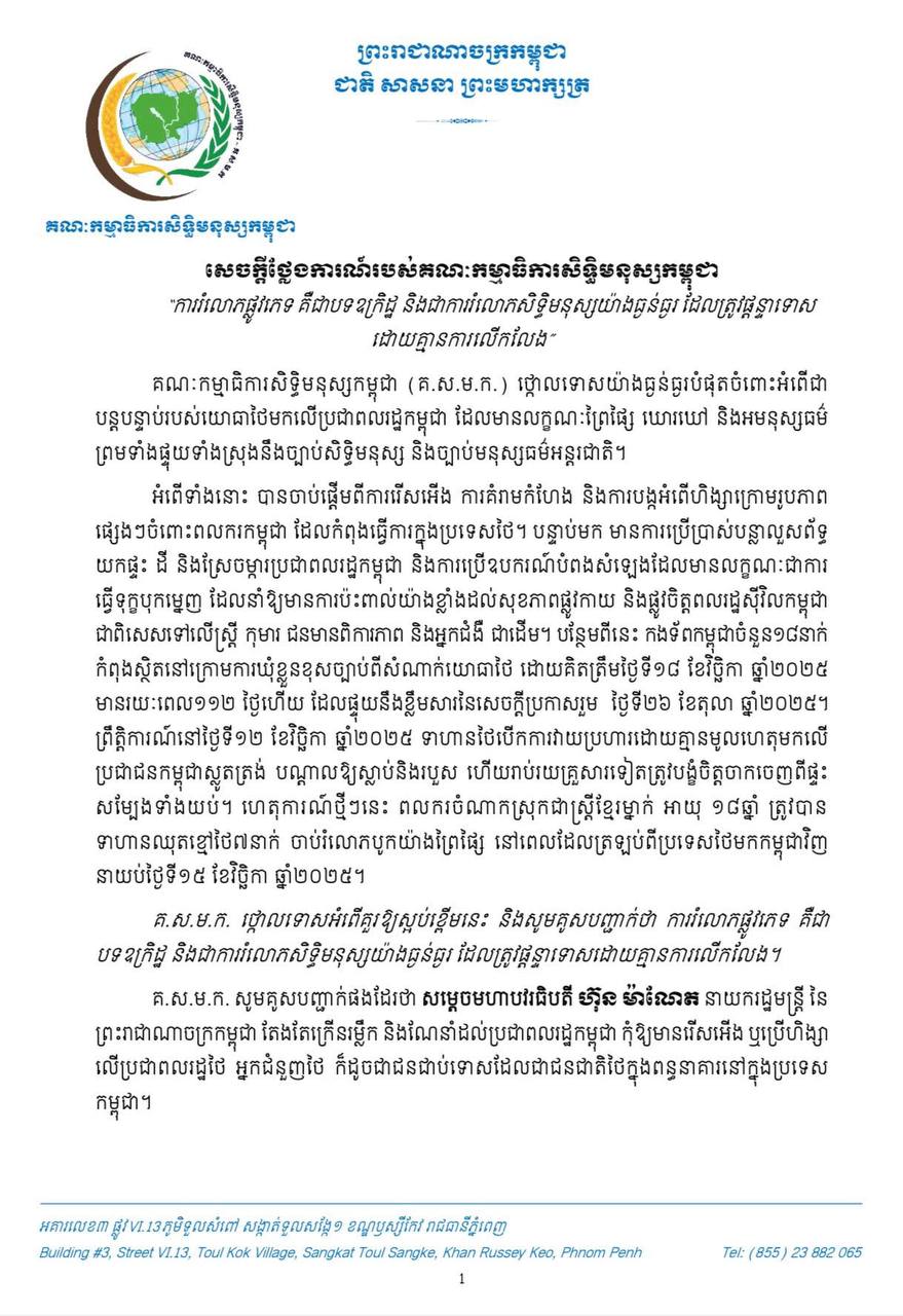 យោងតាមសេចក្តីថ្លែងការណ៍របស់គណៈកម្មាធិការសិទ្ធិមនុស្សកម្ពុជានៅថ្ងៃទី១៨ ខែវិច្ឆិកា ឆ្នាំ២០២៥ បានឱ្យដឹងថា គណៈកម្មាធិការសិទ្ធិមនុស្សកម្ពុជា (គ.ស.ម.ក) ថ្កោលទោសយ៉ាងធ្ងន់ធ្ងរបំផុតចំពោះអំពើជាបន្តបន្ទាប់របស់យោធាថៃមកលើប្រជាពលរដ្ឋកម្ពុជា ដែលមានលក្ខណៈព្រៃផ្សៃ ឃោរឃៅ និងអមនុស្សធម៌ព្រមទាំងផ្ទុយទាំងស្រុងនឹងច្បាប់សិទ្ធិមនុស្ស និងច្បាប់មនុស្សធម៌អន្តរជាតិ។ អំពើទាំងនោះបានចាប់ផ្តើមពីការរើសអើងការគំរាមកំហែង និងការបង្កអំពើហិង្សាក្រោមរូបភាពផ្សេងៗចំពោះពលករកម្ពុជា ដែលកំពុងធ្វើការក្នុងប្រទេសថៃ។