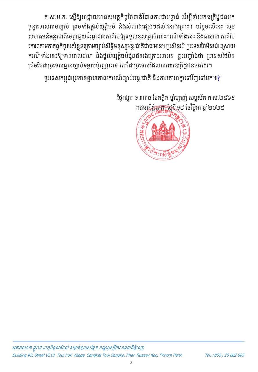 គ.ស.ម.ក ស្នើឱ្យអាជ្ញាធរមានសមត្ថកិច្ចថៃចាត់វិធានការជាបន្ទាន់ ដើម្បីនាំយកឧក្រិដ្ឋជនមកផ្តន្ទាទោសតាមច្បាប់ ព្រមទាំងផ្តល់យុត្តិធម៌ និងសំណងផ្សេងៗដល់ជនរងគ្រោះ។ បន្ថែមពីលើនេះ សូមសហគមន៍អន្តរជាតិមេត្តាជួយជំរុញដល់ភាគីថៃឱ្យទទួលខុសត្រូវចំពោះករណីទាំងនេះនិងធានាថា ភាគីថៃ គោរពតាមកាតព្វកិច្ចរបស់ខ្លួនក្រោមច្បាប់សិទ្ធិមនុស្សអន្តរជាតិជាធរមាន។ ប្រសិនបើ ប្រទេសថៃមិនដោះស្រាយ ករណីទាំងនេះឱ្យទាន់ពេលវេលា និងផ្តល់យុត្តិធម៌ជូនជនរងគ្រោះនោះទេ ឆ្លុះបញ្ចាំងថា ប្រទេសថៃមិន ត្រឹមតែជាប្រទេសគ្មានច្បាប់ទម្លាប់ប៉ុណ្ណោះទេ តែក៏ជាប្រទេសដែលការពារឧក្រិដ្ឋជនផងដែរ។ ប្រទេសកម្ពុជាប្រកាន់ខ្ជាប់គោលការណ៍ច្បាប់អន្តរជាតិ និងការគោរពគ្នាទៅវិញទៅមក៕