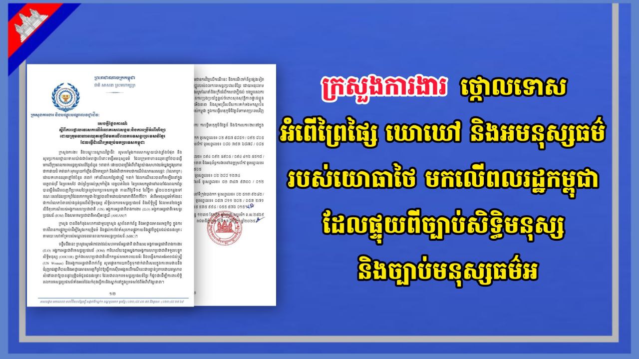 ក្រសួងការងារថ្កោលទោសអំពើព្រៃផ្សៃ ឃោឃៅ និងអមនុស្សធម៌របស់យោធាថៃ មកលើពលរដ្ឋកម្ពុជា ដែលផ្ទុយពីច្បាប់សិទ្ធិមនុស្ស និងច្បាប់មនុស្សធម៌អន្តរជាតិ