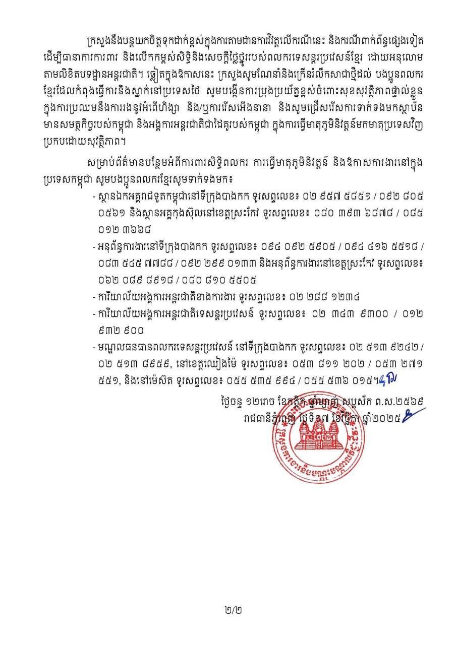 ក្រសួងការងារបាននិងកំពុងសហការជាមួយក្រសួង ស្ថាប័នពាក់ព័ន្ធ និងអាជ្ញាធរមានសមត្ថកិច្ច ក្នុងការ ចាត់វិធានការផ្លូវច្បាប់ដើម្បីស្វែងរកយុត្តិធម៌ និងផ្ដល់ការថែទាំសុខភាពផ្លូវកាយនិងផ្លូវចិត្តជូនដល់ជនរងគ្រោះ តាមរយៈសេវាគាំទ្ររបស់មណ្ឌលធនធានពលករទេសន្តរប្រវេសន៍ (MRC) និងសូមអំពាវនាវដល់សហគមន៍អន្តរជាតិ ជាពិសេស អង្គការអន្តរជាតិខាងការងារ (ILO) អង្គការអន្តរជាតិទេសន្តរប្រវេសន៍ (IOM) ការិយាល័យឧត្តមស្នងការអង្គការសហប្រជាជាតិទទួលបន្ទុក សិទ្ធិមនុស្ស (OHCHR) ភ្នាក់ងារសហប្រជាជាតិលើកកម្ពស់សមភាពយេនឌ័រ និងបង្កើនភាពអង់អាចដល់ស្ត្រី (UN Women) និងអង្គការអន្តរជាតិពាក់ព័ន្ធ សូមផ្តោតការយកចិត្តទុកដាក់ជាពិសេសក្នុងការតាមដាននិងជំរុញរាជរដ្ឋាភិបាលនិងអាជ្ញាធរមានសមត្ថកិច្ចថៃឱ្យធ្វើការស៊ើបអង្កេតលើករណីនេះជាបន្ទាន់ប្រកបដោយតម្លាភាព សំដៅធានាឱ្យបាននូវយុត្តិធម៌ជូនជនរងគ្រោះ ដែលជាពលករទេសន្តរប្រវេសន៍ខ្មែរ ក៏ដូចជាដើម្បីការពារសិទ្ធិពលករទេសន្តរប្រវេសន៍ទាំងអស់ដែលកំពុងធ្វើការនិងស្នាក់នៅក្នុងប្រទេសថៃពីអំពើហិង្សានានា៕