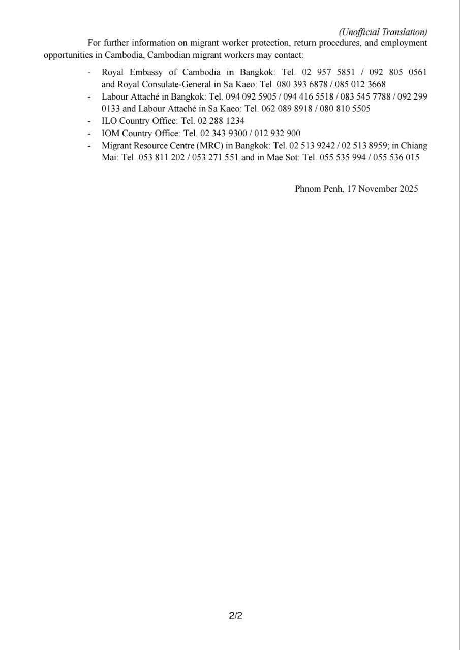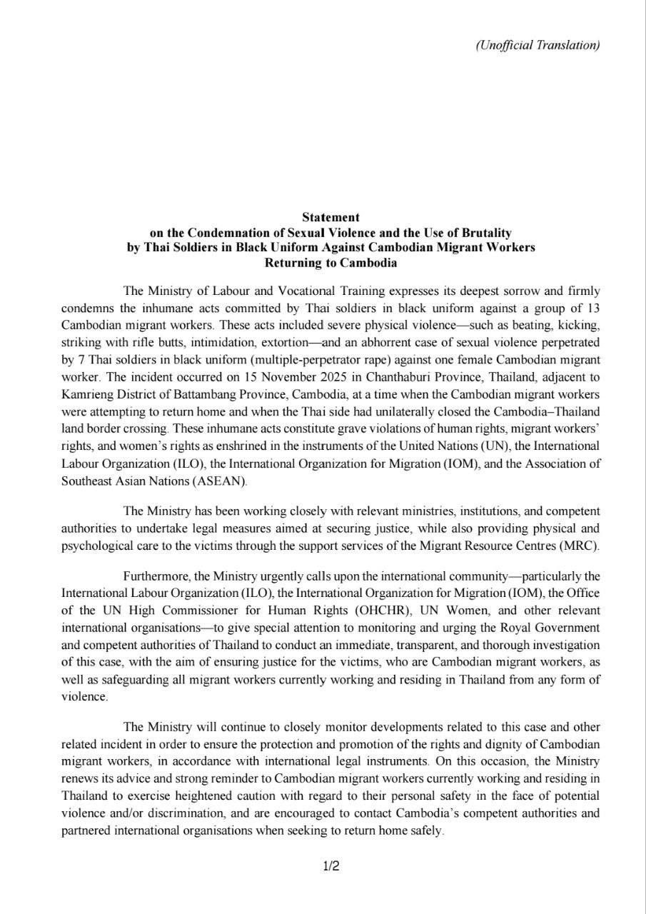 នៅថ្ងៃទី១៨ ខែវិច្ឆិកា ឆ្នាំ២០២៥ ក្រសួងការងារ និងបណ្តុះបណ្តាលវិជ្ជជីវៈសូមសម្តែងការសោកស្តាយយ៉ាងខ្លាំងបំផុត និងសូមប្រកាសថ្កោលទោសយ៉ាងដាច់អហង្ការចំពោះទង្វើអមនុស្សធម៌ ដែលក្រុមទាហានឈុតខ្មៅថៃបានធ្វើ មកលើក្រុមពលករទេសន្តរប្រវេសន៍ខ្មែរចំនួន ១៣នាក់ ដោយបានប្រើអំពើហិង្សាយ៉ាងសាហាវយង់ឃ្នងក្នុងរូបភាព ជាការវាយដំ ទាត់ធាក់ អុកស្វាយកាំភ្លើង ជំរិតទារប្រាក់ និងអំពើថោកទាបជាករណីរំលោភសេពសន្ថវៈ (រំលោភបូក) ដោយទាហានឈុតខ្មៅថៃចំនួន ៧នាក់ ទៅលើពលករខ្មែរជាស្ត្រី ១នាក់។