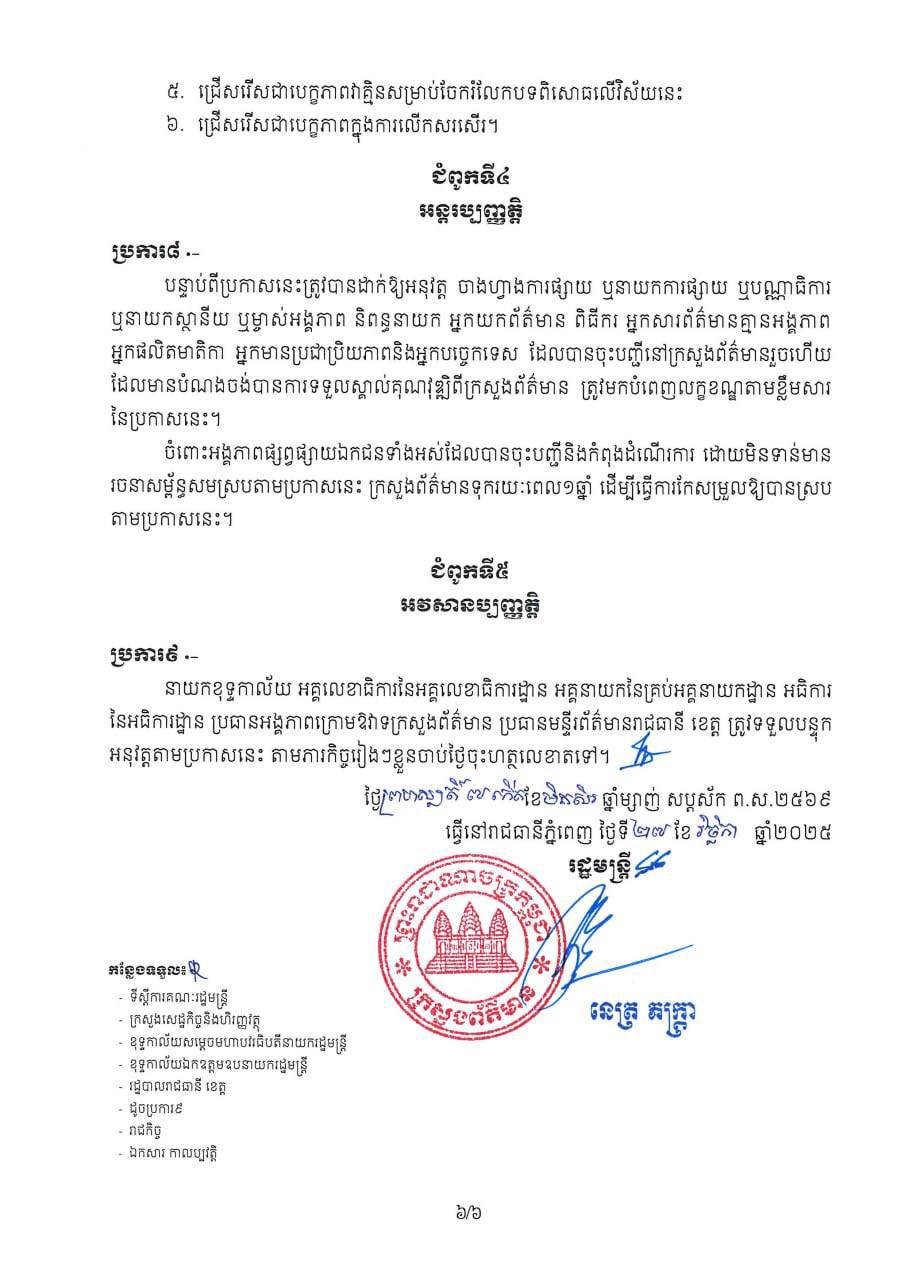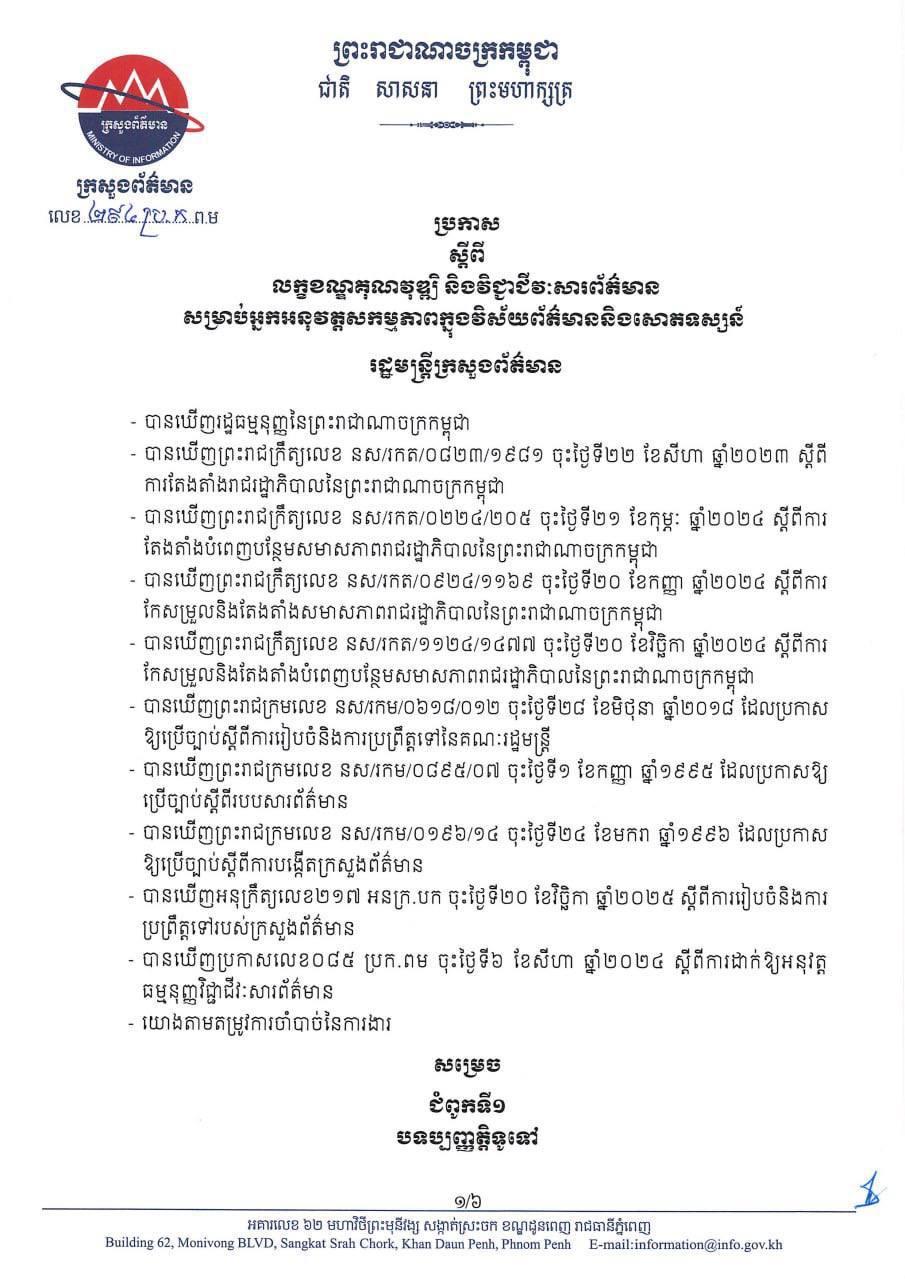 ឯកឧត្តម នេត្រ ភត្រា រដ្ឋមន្ដ្រីក្រសួងព័ត៌មាន បានចេញ ប្រកាសស្តីពីលក្ខខណ្ឌគុណវុឌ្ឍិ និងវិជ្ជាជីវៈសារព័ត៌មានសម្រាប់អ្នកអនុវត្តសកម្មភាពក្នុងវិស័យព័ត៌មាននិងសោតទស្សន៍។ នេះបើតាមការបង្ហោះនៅលើបណ្ដាញសង្គមផ្ទាល់ខ្លួន នៅថ្ងៃទី២៧ ខែវិច្ឆិកា ឆ្នាំ២០២៥នេះ។