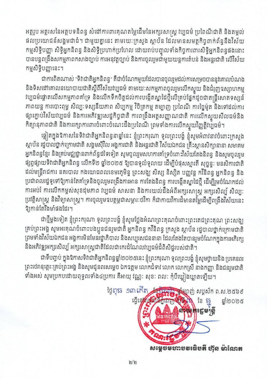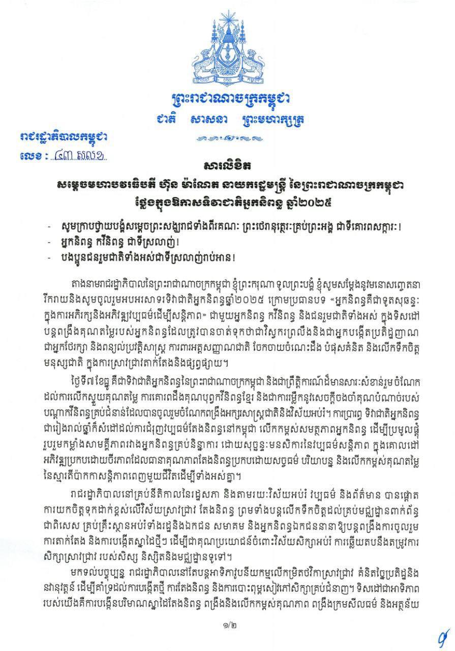 ក្នុងសារលិខិតអបអរសាទរទិវាជាតិអ្នកនិពន្ធ ឆ្នាំ២០២៥ សម្តេចធិបតី ហ៊ុន ម៉ាណែត នាយករដ្ឋមន្រ្តីនៃព្រះរាជាណាចក្រកម្ពុជា បានសម្តែងនូវមនោសញ្ចេតនារីករាយ និងចូលរួមអបអរសាទរទិវាជាតិអ្នកនិពន្ធ ឆ្នាំ ២០២៥ ក្រោមប្រធានបទ «អ្នកនិពន្ធគឺជាទូតសុឆន្ទៈក្នុងការអភិរក្សនិងអភិវឌ្ឍវប្បធម៌ដើម្បីសន្តិភាព»។