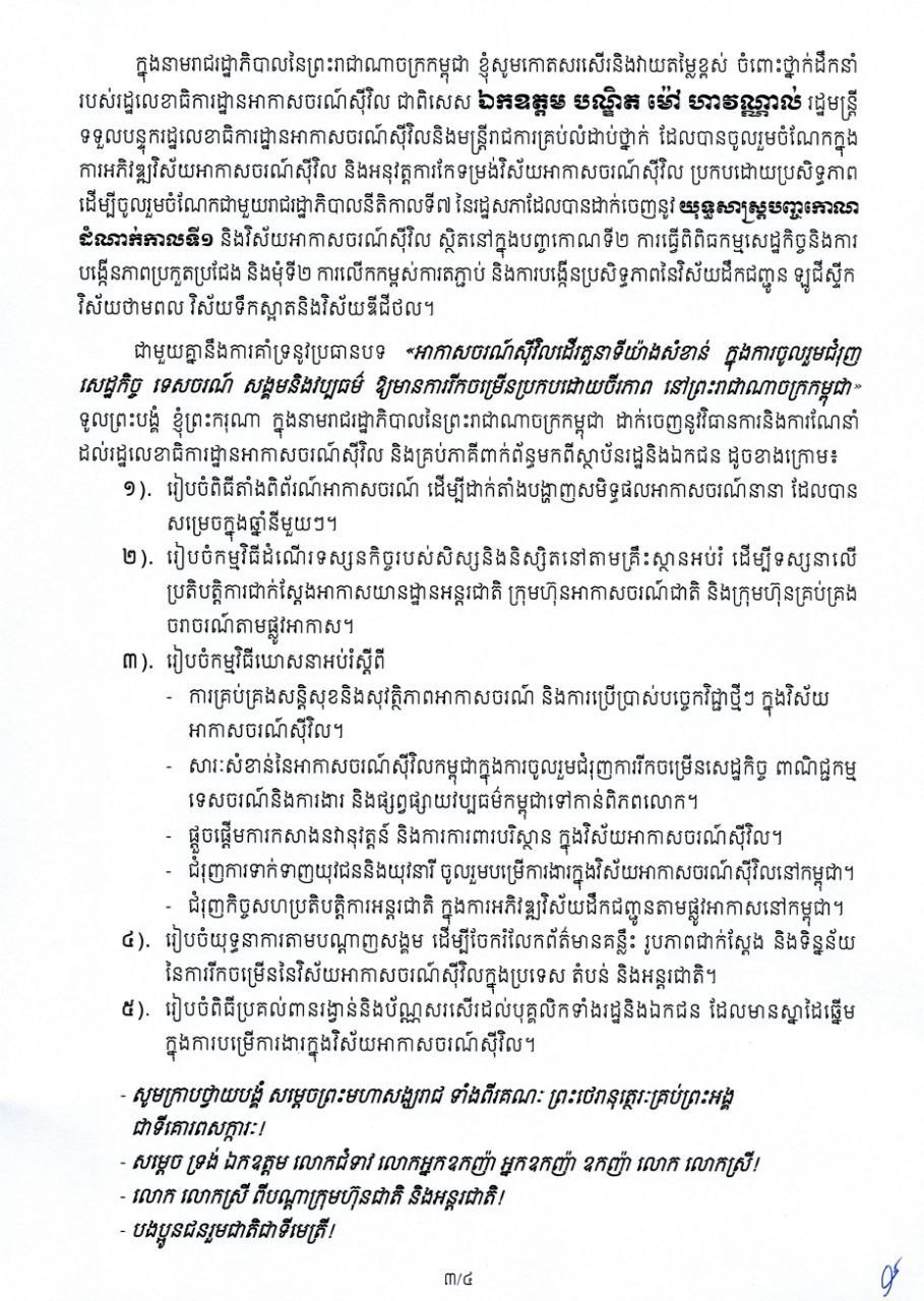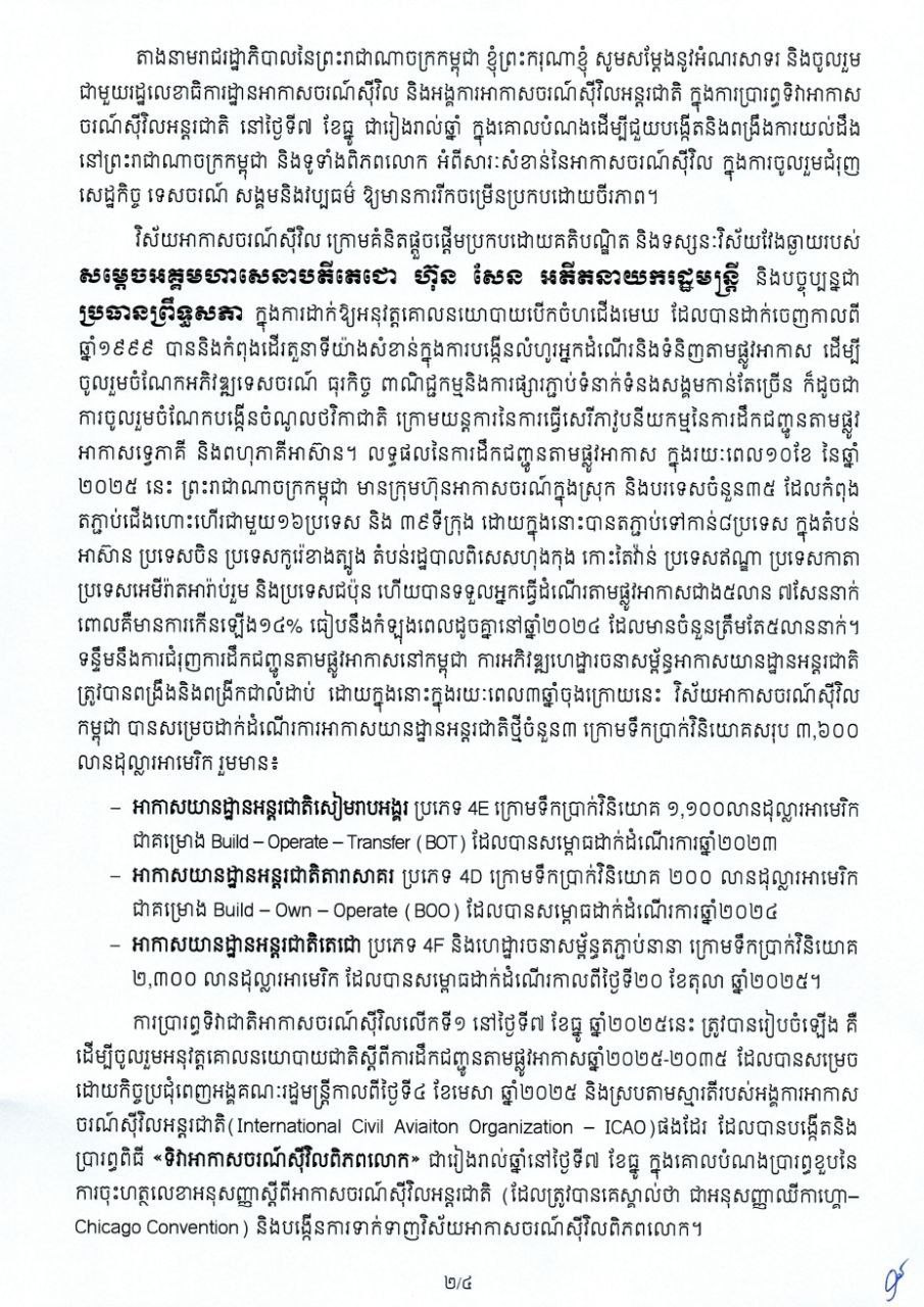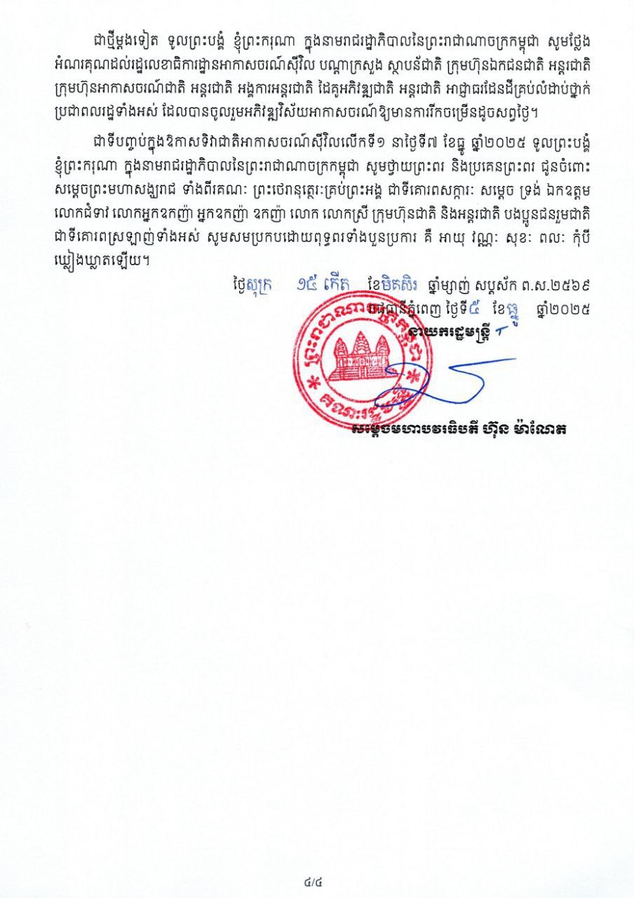 ក្នុងសារលិខិតអបអរសាទរទិវាជាតិអាកាសចរណ៍ស៊ីវិលលើកទី១ ថ្ងៃទី៧ ខែធ្នូ ឆ្នាំ២០២៥ សម្ដេចធិបតី ហ៊ុន ម៉ាណែត នាយករដ្ឋមន្ត្រី នៃព្រះរាជាណាចក្រកម្ពុជា បានគូសបញ្ជាក់ថា ការកំណត់នូវប្រធានបទ «អាកាសចរណ៍ស៊ីវិលដើរតួនាទីយ៉ាងសំខាន់ក្នុងការចូលរួមជំរុញសេដ្ឋកិច្ច ទេសចរណ៍ សង្គមនិងវប្បធម៌ ឱ្យមានការរីកចម្រើនប្រកបដោយចីរភាពនៅព្រះរាជាណាចក្រកម្ពុជា» ជាប្រធានបទដ៏សំខាន់មួយសម្រាប់បង្កើនការយល់ដឹងកាន់តែទូលំទូលាយក្នុងចំណោមពលរដ្ឋទូទាំងប្រទេស បណ្តាស្ថាប័នរដ្ឋាភិបាល ស្ថាប័ននីតិប្បញ្ញត្តិ ស្ថាប័នតុលាការ និងបណ្តាភាគីពាក់ព័ន្ធផ្សេងៗទៀតអំពីសារៈសំខាន់នៃវិស័យអាកាសចរណ៍ស៊ីវិល។