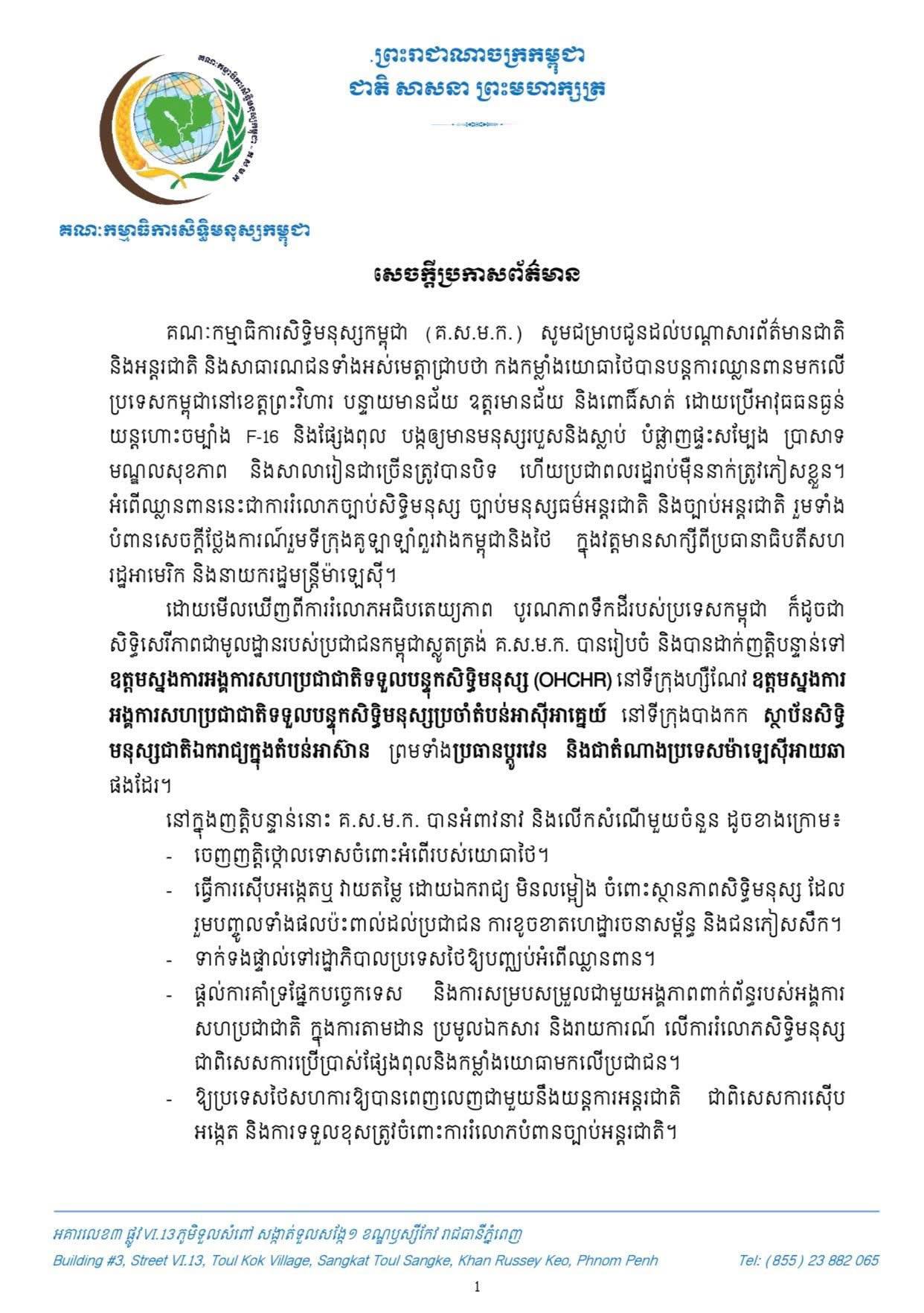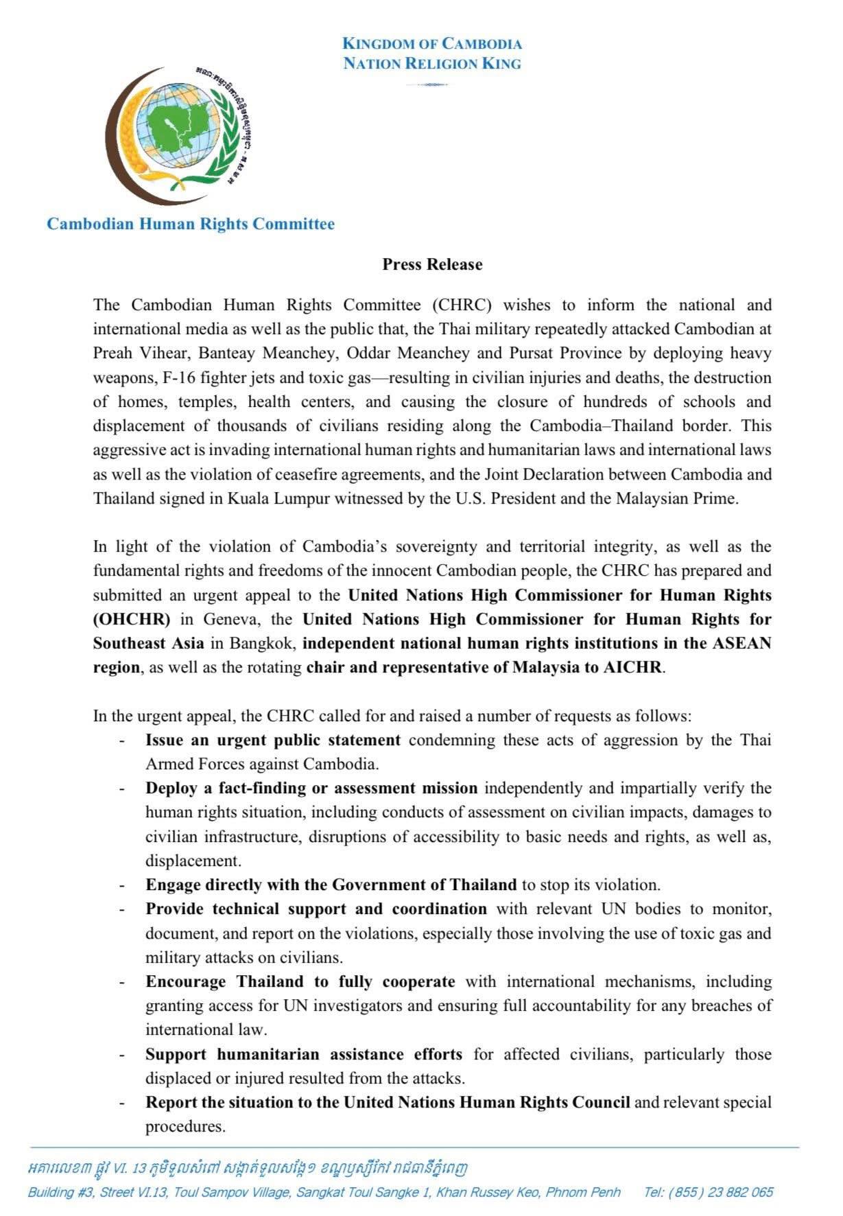 គណៈកម្មការសិទ្ធិមនុស្សកម្ពុជាបានដាក់ញត្តិបន្ទាន់ទៅឧត្តមស្នងការអង្គការសហប្រជាជាតិទទួលបន្ទុកសិទ្ធិមនុស្ស (OHCHR) នៅទីក្រុងហ្សឺណែវ និងស្ថាប័នសិទ្ធិមនុស្សជាតិឯករាជ្យក្នុងតំបន់អាស៊ាន