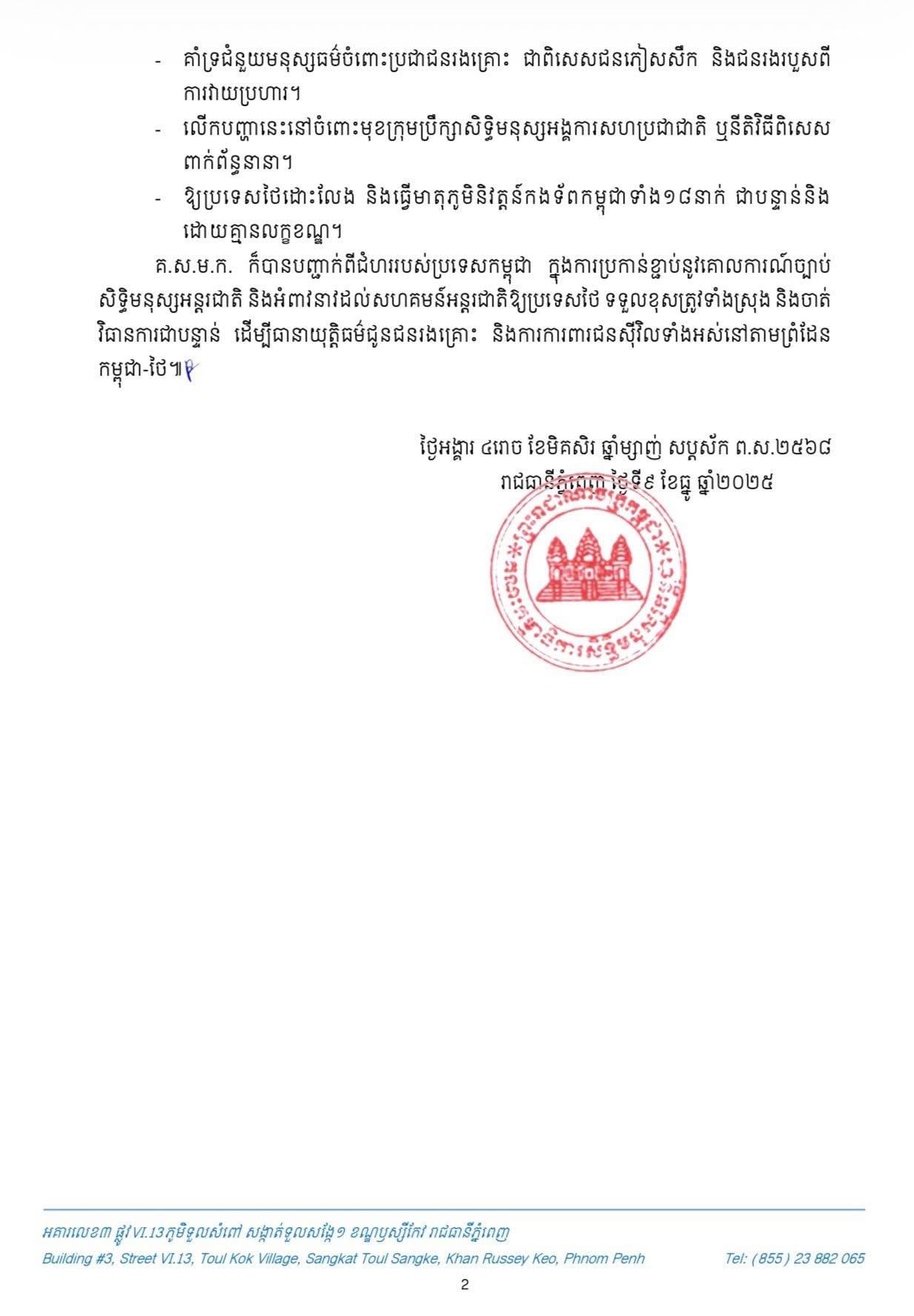 យោងតាមសេចក្តីប្រកាសព័ត៌មានរបស់គណៈកម្មាធិការសិទ្ធិមនុស្សកម្ពុជានៅថ្ងៃទី៩ ខែធ្នូ ឆ្នាំ២០២៥ បានឱ្យដឹងថា កងកម្លាំងយោធាថៃបានបន្តការឈ្លានពានមកលើ ប្រទេសកម្ពុជានៅខេត្តព្រះវិហារ បន្ទាយមានជ័យ ឧត្តរមានជ័យ និងពោធិ៍សាត់ ដោយប្រើអាវុធធនធ្ងន់ យន្តហោះចម្បាំង F-16 និងផ្សែងពុល បង្កឲ្យមានមនុស្សរបួសនិងស្លាប់ បំផ្លាញផ្ទះសម្បែង ប្រាសាទ មណ្ឌលសុខភាព និងសាលារៀនជាច្រើនត្រូវបានបិទ ហើយប្រជាពលរដ្ឋរាប់ម៉ឺននាក់ត្រូវភៀសខ្លួន។ អំពើឈ្លានពាននេះជាការរំលោភច្បាប់សិទ្ធិមនុស្ស ច្បាប់មនុស្សធម៌អន្តរជាតិ និងច្បាប់អន្តរជាតិ រួមទាំង បំពានសេចក្តីថ្លែងការណ៍រួមទីក្រុងគូឡាឡាំពួរវាងកម្ពុជានិងថៃ ក្នុងវត្តមានសាក្សីពីប្រធានាធិបតីសហ រដ្ឋអាមេរិក និងនាយករដ្ឋមន្ត្រីម៉ាឡេស៊ី។