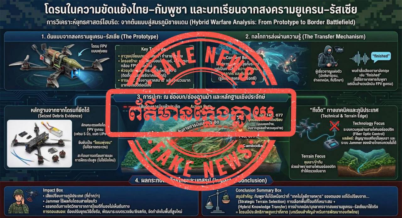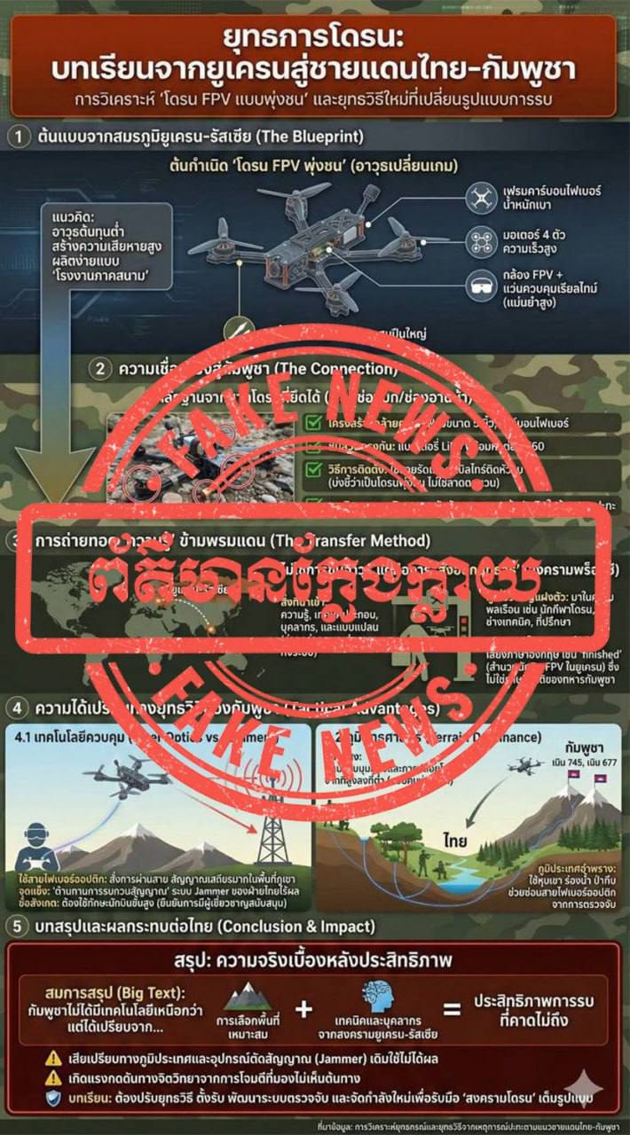 The Ministry of National Defence of Cambodia would like to reject propaganda disseminated on the Thai 2nd Army Area Facebook page, which accused Cambodia of using foreigner to help launch FPV drones in the Cambodian-Thai border conflict. The Ministry asserts that this information is false, fabricated, and intended only to malign Cambodia.