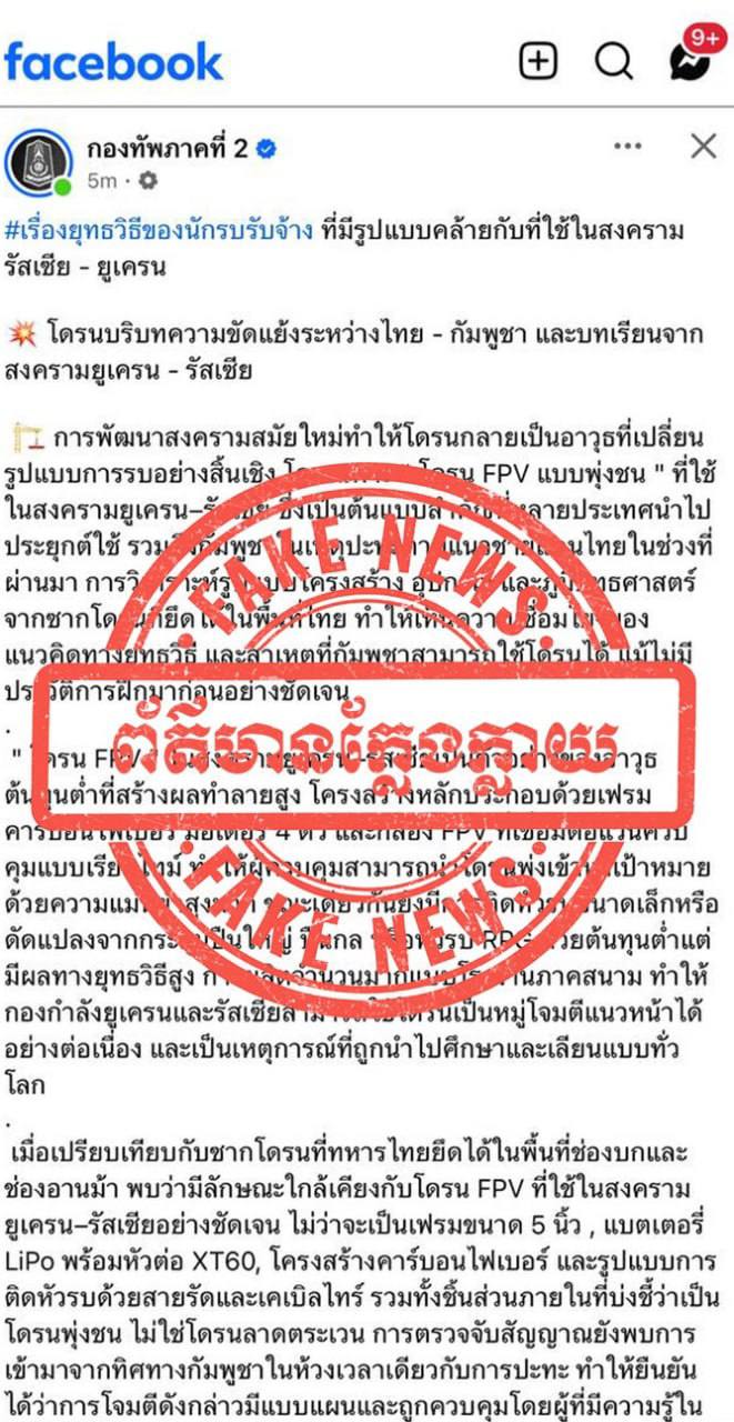 ការផ្សាយរបស់ផេកផ្លូវការកងទ័ពភូមិភាគ២ថៃ ដូចមានភ្ជាប់នេះ គឺជាព័ត៌មានក្លែងក្លាយនិងលាបពណ៌មកលើកម្ពុជាតែប៉ុណ្ណោះ