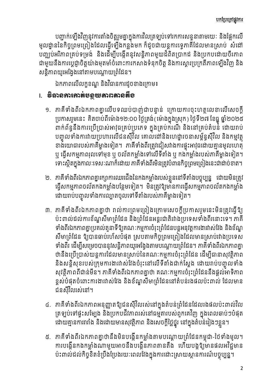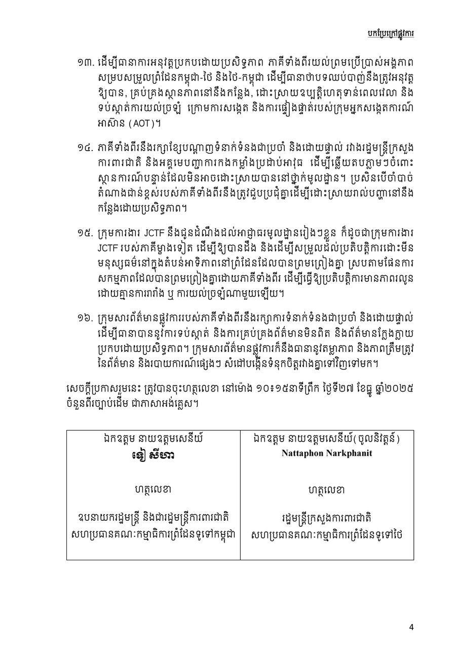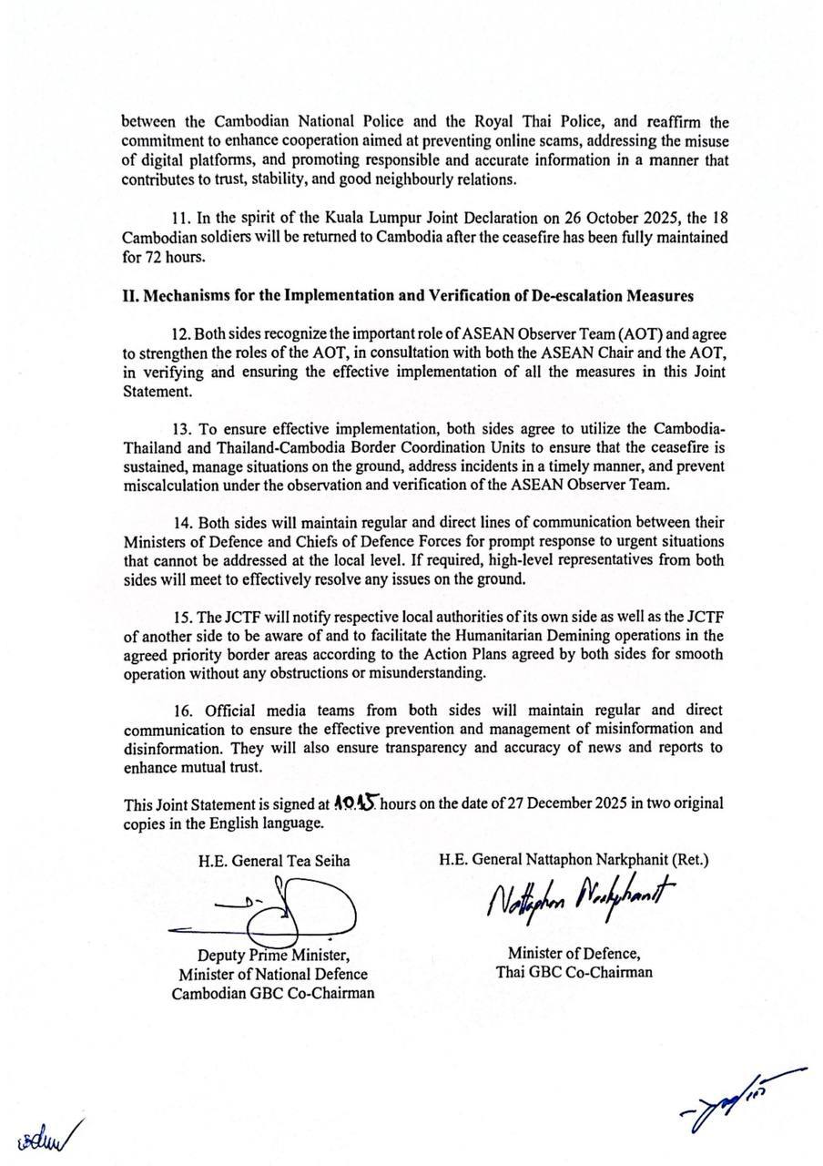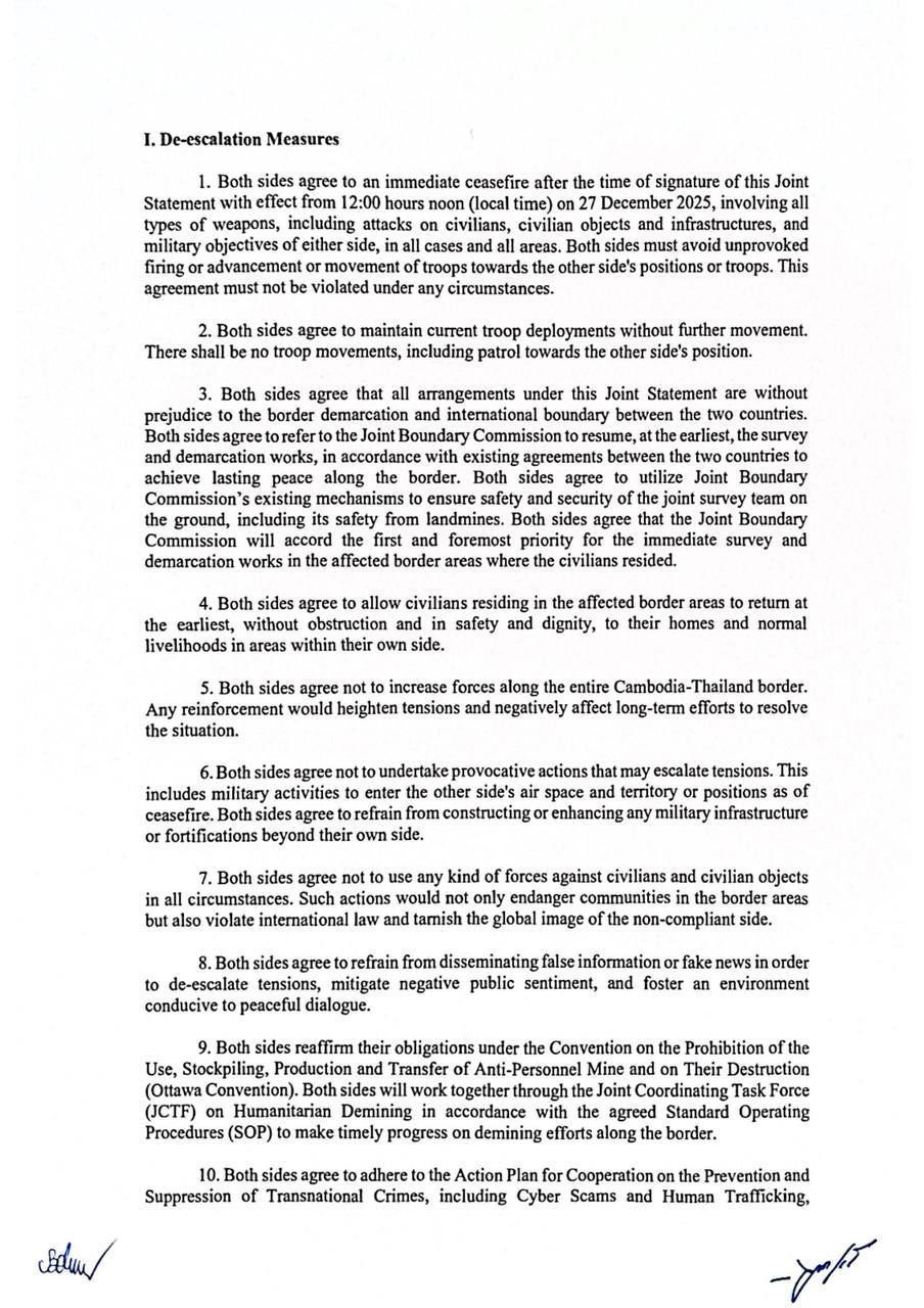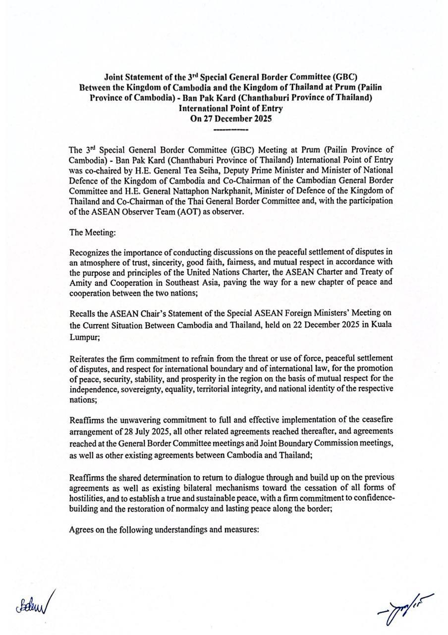 យោងតាមសេចក្ដីថ្លែងការណ៍រួមនៃកិច្ចប្រជុំពិសេសគណៈកម្មាធិការព្រំដែនទូទៅ (GBC) លើកទី៣ រវាងព្រះរាជាណាចក្រកម្ពុជា និងព្រះរាជាណាចក្រថៃ នៅច្រកព្រំដែនអន្តរជាតិព្រំ ខេត្តប៉ៃលិន ប្រទេសកម្ពុជា-បានផាកកាត ខេត្តចន្ទបុរី ប្រទេសថៃ នៅថ្ងៃទី២៧ ធ្នូ ២០២៥ បានឱ្យដឹងថា កម្ពុជា-ថៃបានឯកភាពគ្នាលើបទឈប់បាញ់ជាបន្ទាន់ ក្រោយការចុះហត្ថលេខាលើសេចក្តីប្រកាសរួមនេះ គិតចាប់ពីម៉ោង១២:០០ ថ្ងៃត្រង់ ថ្ងៃទី២៧ ខែធ្នូ ឆ្នាំ២០២៥ ពាក់ព័ន្ធនឹងការប្រើប្រាស់អាវុធគ្រប់ប្រភេទ ក្នុងគ្រប់ករណី និងនៅគ្រប់តំបន់ ដោយរាប់បញ្ចូលទាំងការវាយប្រហារលើជនស៊ីវិល គោលដៅនិងហេដ្ឋារចនាសម្ព័ន្ធស៊ីវិល និងកម្មវត្ថុ ខាងយោធារបស់ភាគីម្ខាងទៀត។