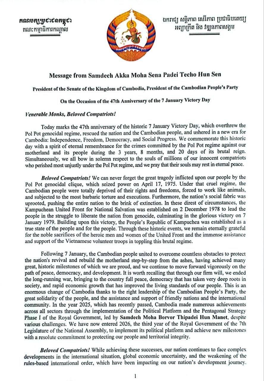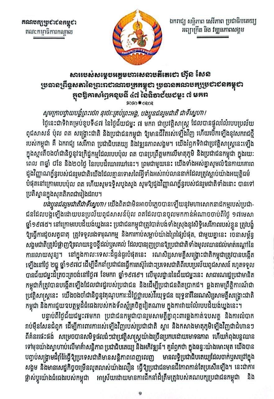 នៅក្នុងសារលិខិតក្នុងឱកាសខួបទី៤៧នៃទិវាជ័យជម្នះ ៧មករា សម្តេចតេជោ ហ៊ុន សែន ប្រធានព្រឹទ្ធសភា និងជាប្រធានគណបក្សប្រជាជនកម្ពុជា បានគូសបញ្ជាក់ថា កម្ពុជាសូមបញ្ជាក់ជាថ្មីនូវការប្តេជ្ញាចិត្តយ៉ាងមុតមាំក្នុងការខិតខំដើម្បីសម្រេចនូវគោលដៅចម្បងរបស់ខ្លួនគឺការបញ្ចប់ទុក្ខវេទនារបស់ប្រជាជន ទប់ស្កាត់ការបំផ្លិចបំផ្លាញ និងបន្តដើរលើមាគ៌ាឆ្ពោះទៅរកសន្តិភាព ដំណោះស្រាយប្រកបដោយយុត្តិធម៌ និងចីរកាល ទន្ទឹមនោះ កម្ពុជានឹងមិនធ្វើសម្បទាននូវអធិបតេយ្យឬសេចក្តីថ្លៃថ្នូរបស់ខ្លួនឡើយ។