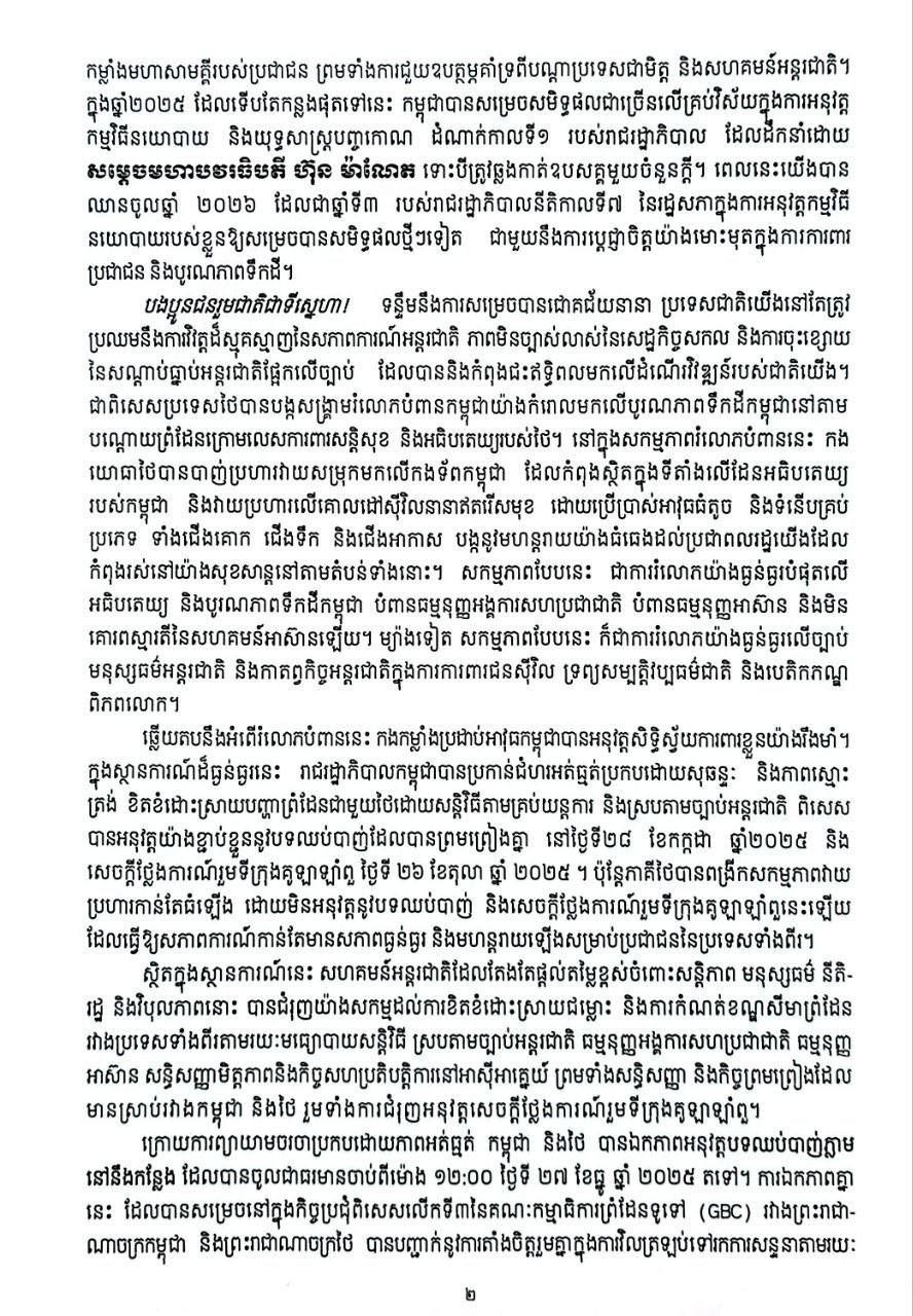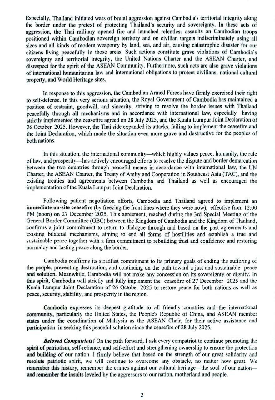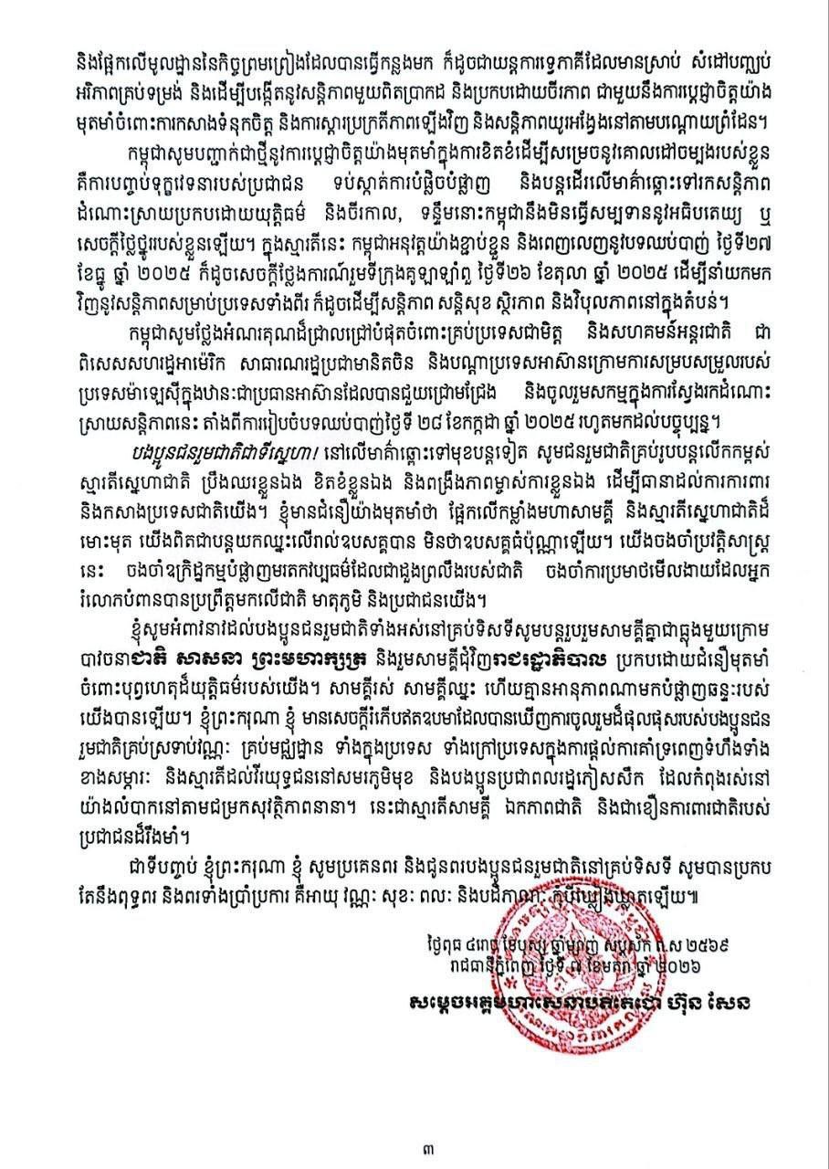 នៅក្នុងសារលិខិតដដែលនោះដែរ សម្តេចតេជោ ហ៊ុន សែន ក៏បានបញ្ជាក់ជាថ្មីថា កម្ពុជាអនុវត្តយ៉ាងខ្ជាប់ ខ្ជួននិងពេញលេញនូវបទឈប់បាញ់ថ្ងៃទី២៧ ខែធ្នូ ឆ្នាំ២០២៥ ក៏ដូចជាសេចក្តីថ្លែងការណ៍រួមទីក្រុងគូឡាឡាំពួ ថ្ងៃទី២៦ ខែតុលា ឆ្នាំ២០២៥ដើម្បីនាំយកមកវិញនូវសន្តិភាពសម្រាប់ប្រទេសទាំងពីរក៏ដូចជាដើម្បី សន្តិភាព សន្តិសុខ ស្ថិរភាព និងវិបុលភាពនៅក្នុងតំបន់៕