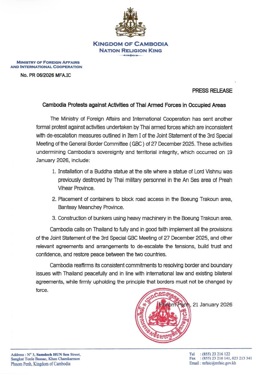 យោងតាមសេចក្តីប្រកាសព័ត៌មានរបស់ក្រសួងការបរទេស និងសហប្រតិបត្តិការអន្តរជាតិ នៅថ្ងៃទី២១ ខែមករា ឆ្នាំ២០២៥ ដែលមានខ្លឹមសារថា កម្ពុជាតវ៉ាផ្លូវការជាថ្មីម្ដងទៀតប្រឆាំងចំពោះដែលសកម្មភាពរបស់កងកម្លាំងប្រដាប់អាវុធថៃ ដែលផ្ទុយទៅនឹងវិធានការកាត់បន្ថយភាពតានតឹងមានចែងក្នុងចំណុចទី១ នៃសេចក្តីប្រកាសរួមនៃកិច្ចប្រជុំពិសេសលើកទី៣ របស់គណៈកម្មាធិការព្រំដែនទូទៅ (GBC) ចុះថ្ងៃទី២៧ ខែធ្នូ ឆ្នាំ២០២៥។ សកម្មភាពទាំងនេះ ដែលបានប៉ះពាល់ធ្ងន់ធ្ងរដល់អធិបតេយ្យ និងបូរណភាពទឹកដីរបស់កម្ពុជា បង្កឡើងនៅថ្ងៃទី១៩ ខែមករា ឆ្នាំ២០២៦ រួមមានដូចជា៖