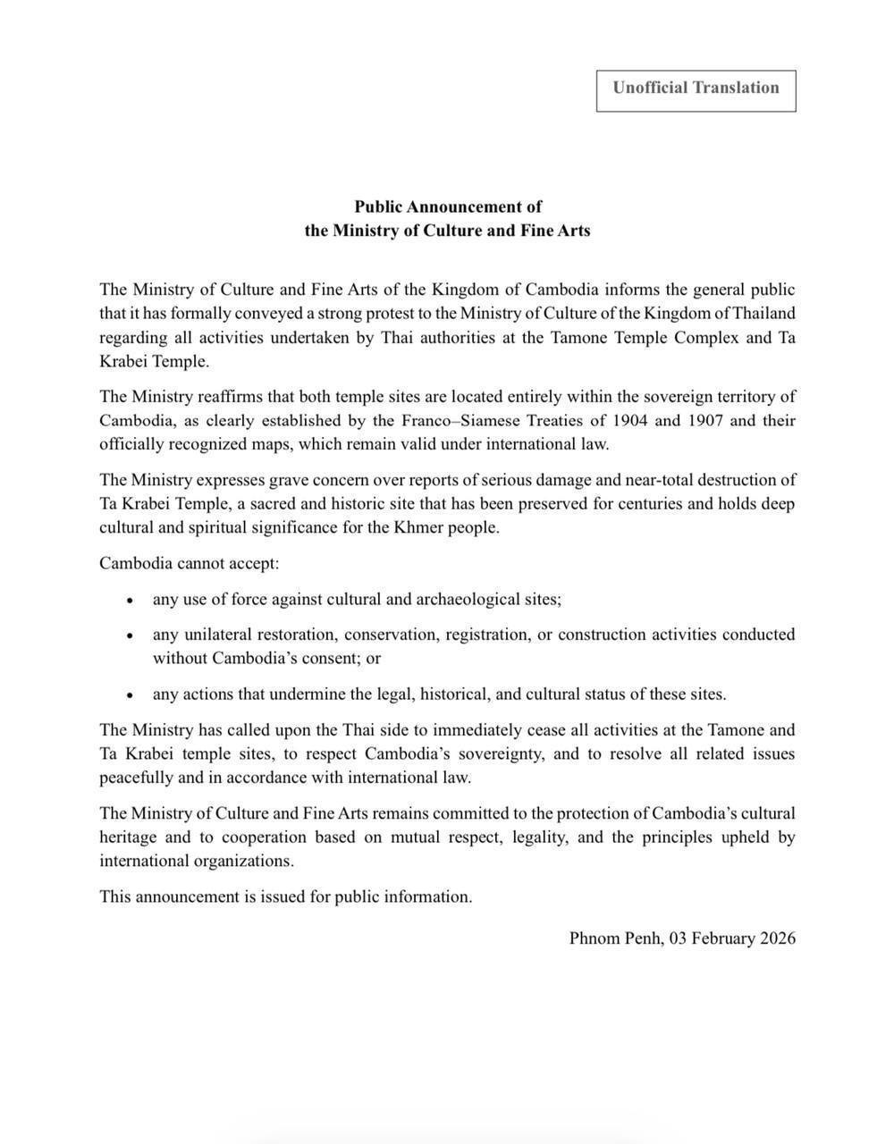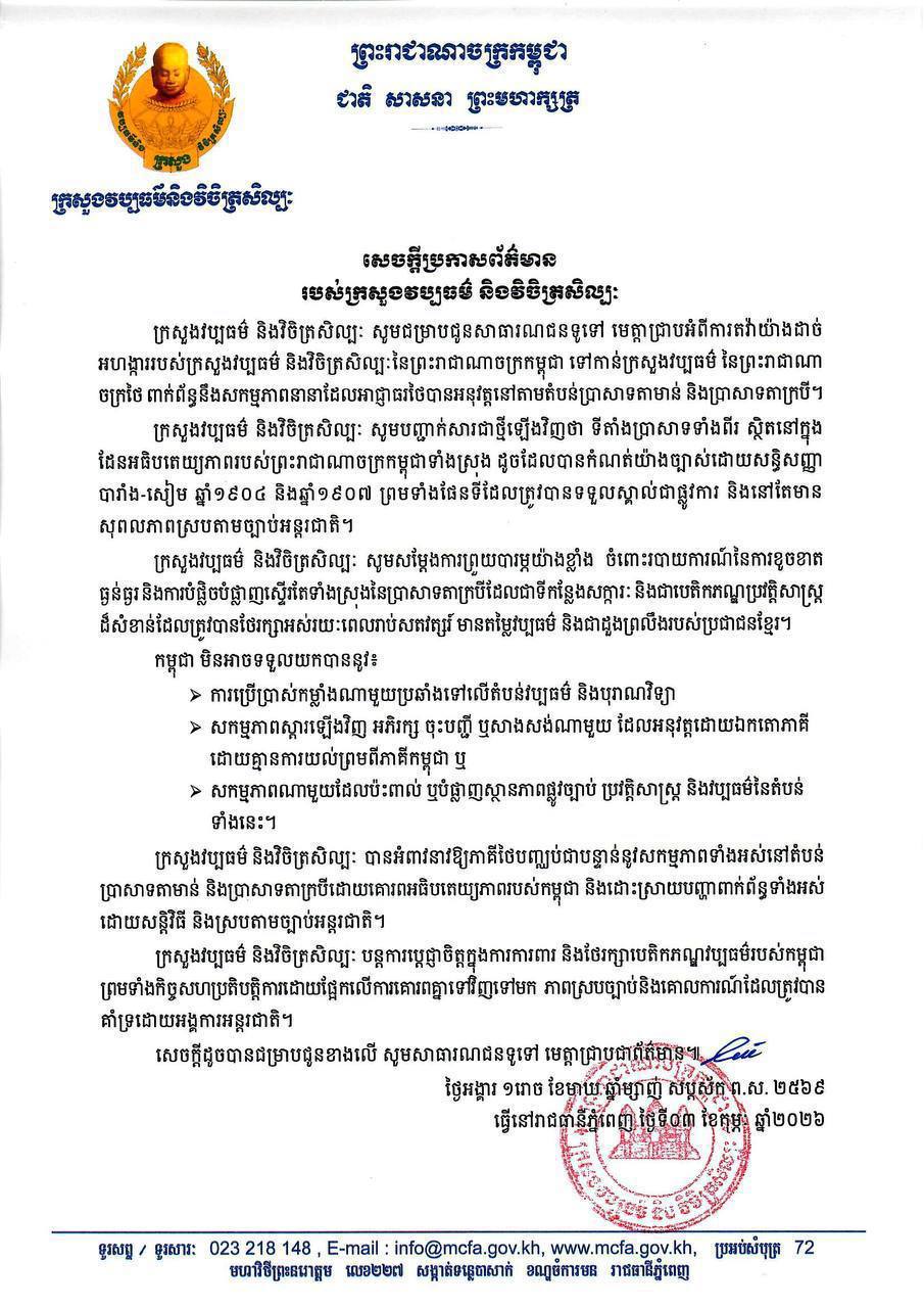 នៅថ្ងៃទី៣ ខែកុម្ភៈ ឆ្នាំ២០២៦ ក្រសួងវប្បធម៌ និងវិចិត្រសិល្បៈ បានធ្វើការតវ៉ាយ៉ាងដាច់អហង្ការចំពោះក្រសួងវប្បធម៌ថៃ ដែលពាក់ព័ន្ធនឹងសកម្មភាពនានាដែលអាជ្ញាធរថៃបានអនុវត្តនៅតាមតំបន់ប្រាសាទតាមាន់ និងប្រាសាទតាក្របី ដែលប្រាសាទទាំងពីរនេះស្ថិតនៅក្នុងដែនអធិបតេយ្យភាពរបស់ប្រទេសកម្ពុជាទាំងស្រុង ដូចដែលបានកំណត់យ៉ាងច្បាស់ដោយសន្ធិសញ្ញ បារាំង-សៀម ឆ្នាំ១៩០៤ និងឆ្នាំ១៩០៧ ព្រមទាំងផែនទីដែលត្រូវបានទទួលស្គាល់ជាផ្លូវការ និងនៅតែមានសុពលភាពស្របតាមច្បាប់អន្តរជាតិ។