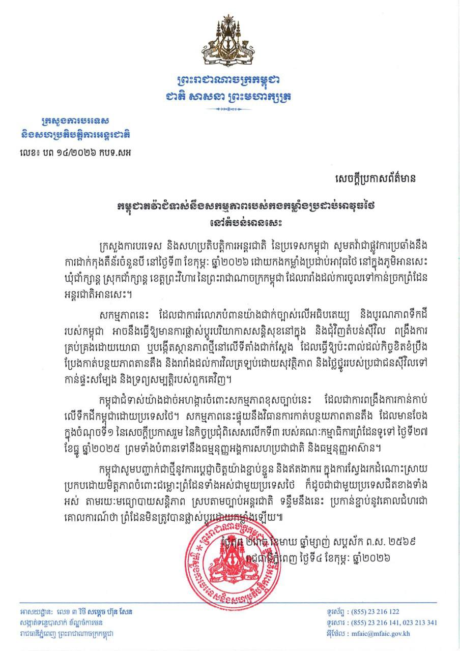 កម្ពុជាជំទាស់យ៉ាងដាច់អហង្ការចំពោះសកម្មភាពខុសច្បាប់នេះ ដែលជាការពង្រឹងការកាន់កាប់ លើទឹកដីកម្ពុជាដោយប្រទេសថៃ។ សកម្មភាពនេះផ្ទុយនឹងវិធានការកាត់បន្ថយភាពតានតឹង ដែលមានចែង ក្នុងចំណុចទី១ នៃសេចក្ដីប្រកាសរួម នៃកិច្ចប្រជុំពិសេសលើកទី៣ របស់គណៈកម្មាធិការព្រំដែនទូទៅ (GBC) ថ្ងៃទី២៧ ខែធ្នូ ឆ្នាំ២០២៥ ព្រមទាំងបំពានទៅនឹងធម្មនុញ្ញអង្គការសហប្រជាជាតិ និងធម្មនុញ្ញអាស៊ាន។