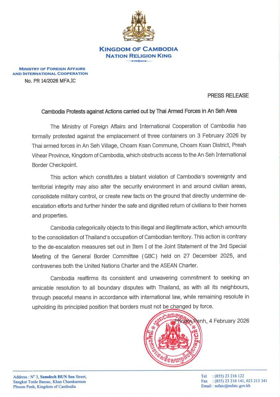 ក្រសួងការបរទេសនិងសហប្រតិបត្តិការអន្តរជាតិនៃព្រះរាជាណាចក្រកម្ពុជានៅថ្ងៃទី៤ ខែកុម្ភៈ ឆ្នាំ២០២៦ បានធ្វើការតវ៉ាជាផ្លូវការប្រឆាំងនឹងការដាក់កុងតឺន័រចំនួនបី ដោយកងកម្លាំងប្រដាប់អាវុធថៃ នៅក្នុងភូមិអានសេះ ឃុំជាំក្សាន្ត ស្រុកជាំក្សាន្ត ខេត្តព្រះវិហារ នៃព្រះរាជាណាចក្រកម្ពុជា ដែលរារាំងដល់ការចូលទៅកាន់ច្រកព្រំដែនអន្តរជាតិអានសេះ។ នេះបើយោងតាមសេចក្តីប្រកាសព័ត៌មានរបស់ក្រសួងការបរទេសកម្ពុជា។