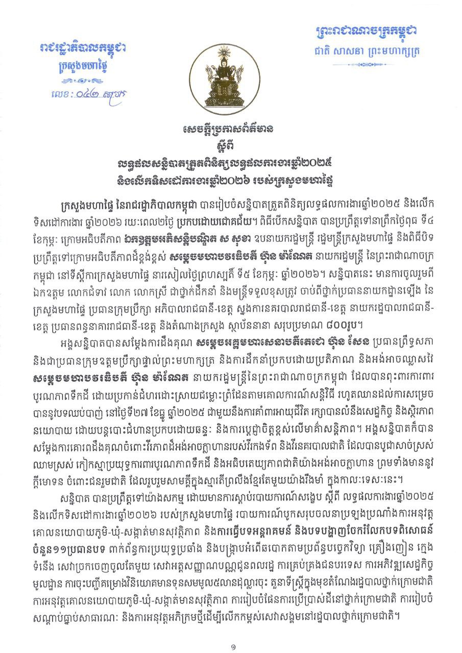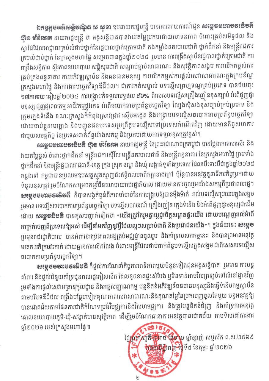 យោងតាមសេចក្តីប្រកាសព័ត៌មានស្តីពីលទ្ធផលសន្និបាតត្រួតពិនិត្យលទ្ធផលការងារឆ្នាំ២០២៥ និងលើកទិស ដៅការងារឆ្នាំ២០២៦ របស់ក្រសួងមហាផ្ទៃ បានឱ្យដឹងថា នៅថ្ងៃទី៥ ខែកុម្ភៈ ឆ្នាំ២០២៦ សម្តេចធិបតី ហ៊ុន ម៉ាណែត នាយករដ្ឋមន្រ្តីនៃកម្ពុជា បានសង្កត់ធ្ងន់ពីភាពចាំបាច់នៃការបង្រ្កាបឱ្យបានម៉ឺងម៉ាត់រាល់បទល្មើសប្រឈមក្នុងសង្គម រួមមាន បទល្មើសឆបោកតាមប្រព័ន្ធបច្ចេកវិទ្យា បទល្មើសចរាចរណ៍ គ្រឿងញៀន ក្មេងទំនើង និងអំពើជួញដូរមនុស្សជាដើម ដោយសម្តេចបានគូសបញ្ជាក់ទៀតថា «យើងត្រូវតែរួមគ្នាប្តេជ្ញាចិត្ត សម្អាតផ្ទះយើងដោយបណ្តេញរាល់អំពើអាក្រក់ចេញពីប្រទេសឱ្យអស់ដើម្បីនាំមកវិញនូវអ្វីដែលល្អៗសម្រាប់ជាតិនិងប្រជាជនយើង»។