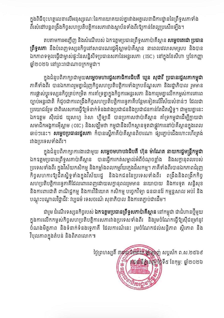 សូមជម្រាបជូនថា ដំណើរទស្សនកិច្ចរបស់ ឯកឧត្តមប្រធានព្រឹទ្ធសភាប៉ាគីស្ថាន នៅកម្ពុជា ជាជំហានថ្មីមួយ ក្នុងការលើកកម្ពស់កិច្ចសហប្រតិបត្តិការសភារវាងប្រទេសទាំងពីរ និងរួមចំណែកធ្វើឱ្យស៊ីជម្រៅនូវចំណងមិត្តភាព និងទំនាក់ទំនងទ្វេភាគី ដែលការណ៍នេះ រួមចំណែកដល់សន្តិភាព ស្ថិរភាព និង វិបុលភាពក្នុងតំបន់ និងពិភពលោក៕
