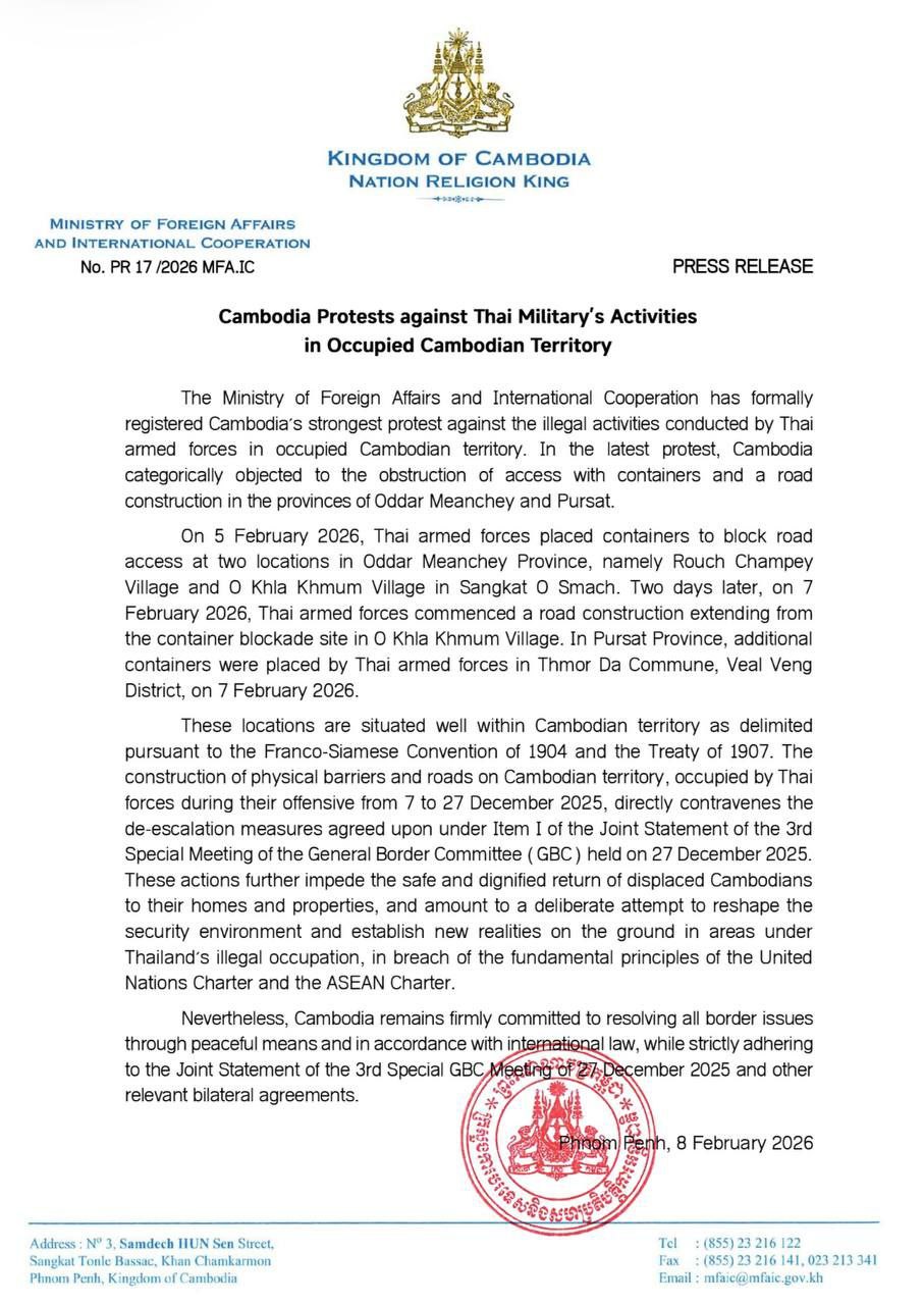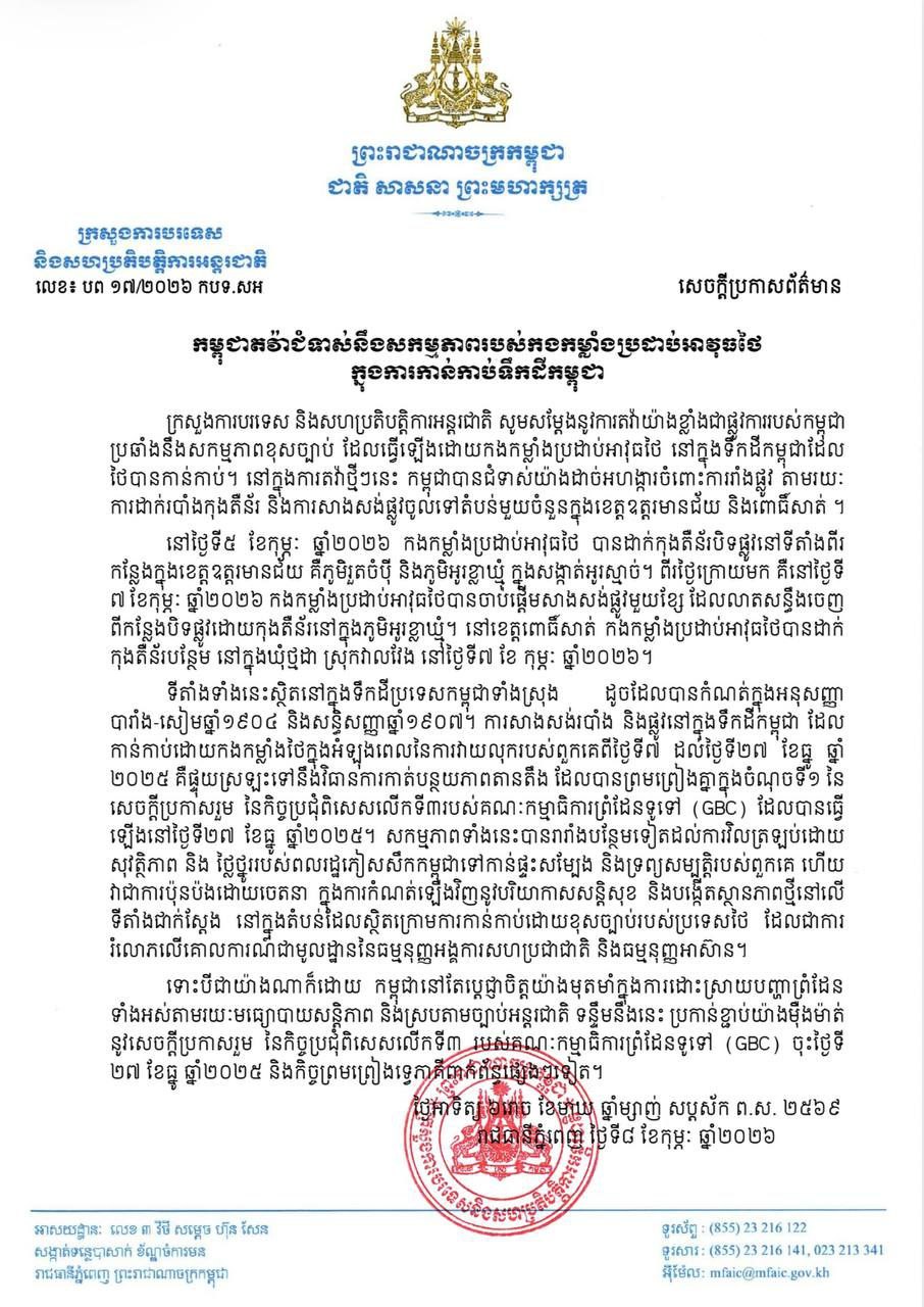 ក្រសួងការបរទេស និងសហប្រតិបត្តិការអន្តរជាតិនៃព្រះរាជាណាចក្រកម្ពុជានៅថ្ងៃទី៨ ខែកុម្ភៈ ឆ្នាំ២០២៦ បានធ្វើការតវ៉ាយ៉ាងខ្លាំងជំទាស់ប្រឆាំងនឹងសកម្មភាពខុសច្បាប់ដែលធ្វើឡើងដោយកងកម្លាំងប្រដាប់អាវុធថៃ ក្នុងការកាន់កាប់ទឹកដីកម្ពុជា តាមរយៈការដាក់របាំងកុងតឺន័រ និងការសាងសង់ផ្លូវចូលទៅតំបន់មួយចំនួនក្នុងខេត្តឧត្ដរមានជ័យ និងពោធិ៍សាត់។