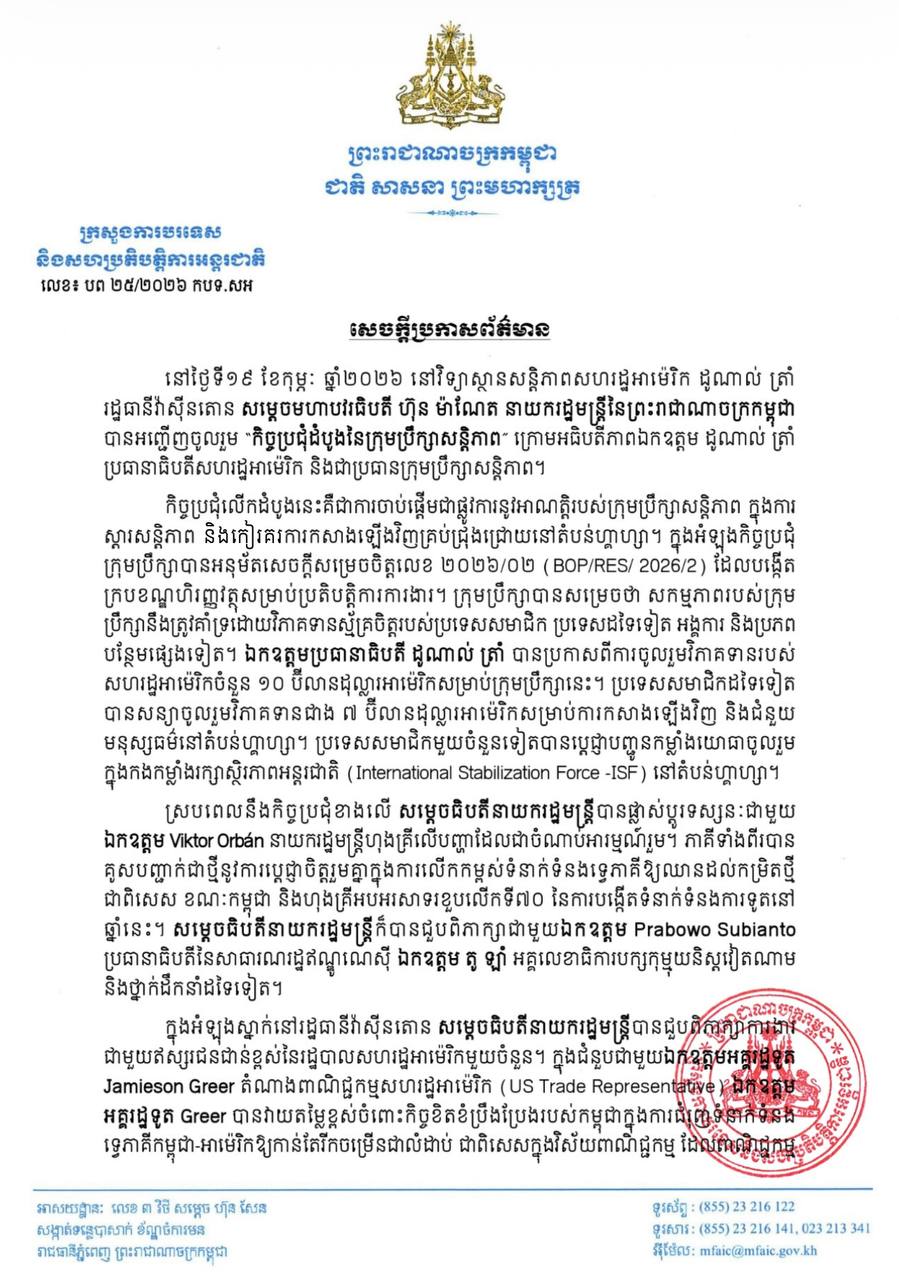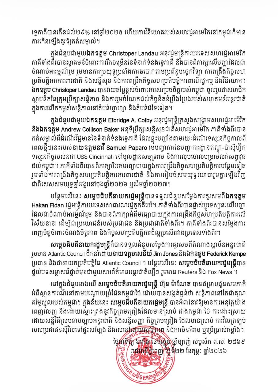 សេចក្តីប្រកាសផ្លូវការរបស់ក្រសួងការបរទេស នៅថ្ងៃទី២២ ខែកុម្ភៈ ឆ្នាំ២០២៦ បានបញ្ជាក់ថា «សម្តេចធិបតីនាយករដ្ឋមន្ត្រី ហ៊ុន ម៉ាណែត បានជម្រាបជូនសមភាគី អំពីស្ថានការណ៍នៅតាមបណ្ដោយព្រំដែន កម្ពុជាថៃ ដោយបានសង្កត់ធ្ងន់ថា សន្តិភាពនៅតែជាគុណតម្លៃស្នូលរបស់កម្ពុជា។ ក្នុងន័យនេះ សម្តេចធិបតីនាយករដ្ឋមន្ត្រី បានអំពាវនាវឱ្យមានការអនុវត្តយ៉ាងពេញលេញ និងដោយស្មោះត្រង់នូវកិច្ចព្រមព្រៀងដែលមានស្រាប់ រវាងកម្ពុជា-ថៃ ការដោះស្រាយដោយសន្តិវិធីស្របតាមច្បាប់ អន្តរជាតិ និងសន្ធិសញ្ញា កិច្ចព្រមព្រៀង ដែលមានស្រាប់ ការវិលត្រឡប់របស់ប្រជាជនស៊ីវិលទៅផ្ទះសម្បែង និងរស់នៅដោយសុវត្ថិភាព និងការមិនគំរាម ឬប្រើប្រាស់កម្លាំង»។