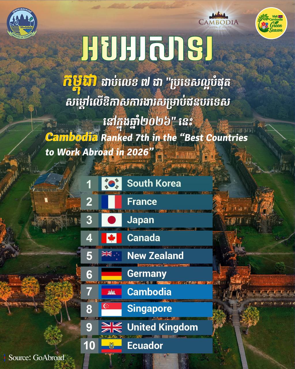 កម្ពុជា ជាប់លេខ ៧ ជា “ប្រទេសល្អបំផុត សម្តៅលើឱកាសការងារ សម្រាប់ជនបរទេស នៅក្នុងឆ្នាំ២០២៦” នេះ កម្ពុជា ជាប់លេខ ៧ ជា “ប្រទេសល្អបំផុត សម្តៅលើឱកាសការងារ សម្រាប់ជនបរទេស នៅក្នុងឆ្នាំ២០២៦” នេះ