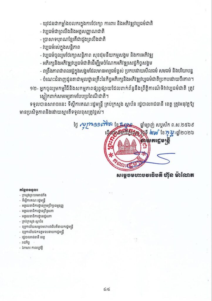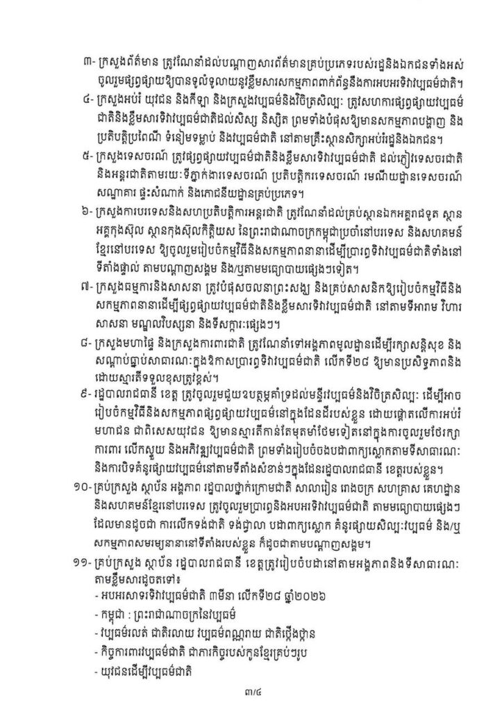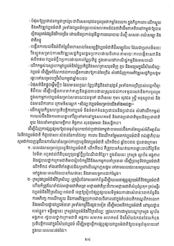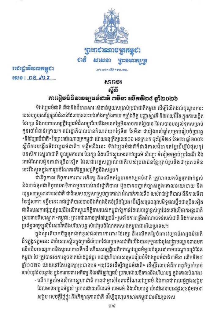 យោងតាមសារាចរស្តីពីការរៀបចំទិវាវប្បធម៌ជាតិ ៣មីនា លើកទី២៨ ឆ្នាំ២០២៦ សម្ដេចធិបតី ហ៊ុន ម៉ាណែត នាយករដ្ឋមន្ត្រីនៃព្រះរាជាណាចក្រកម្ពុជា បានគូស បញ្ជាក់ថាក្នុងស្មារតីយកចិត្តទុកដាក់ខ្ពស់ដល់ការការពារ ថែរក្សានិងលើកតម្លៃចំពោះវប្បធម៌អារ្យធម៌ជាតិដ៏ឧត្តុង្គឧត្តមនេះ ជាពិសេសស្ថិតក្នុងគ្រាដ៏លំបាកដែលប្រទេសជាតិយើងបានទទួលរងនូវសង្គ្រាមឈ្លានពានមកលើអធិបតេយ្យភាពនិងបូរណភាពទឹកដីហើយសម្បត្តិបេតិកភណ្ឌវប្បធម៌មួយចំនួននៅតាមបណ្តោយព្រំដែនកម្ពុជា-ថៃ ត្រូវបានរងការខូចខាតយ៉ាងធ្ងន់ធ្ងរ រាជរដ្ឋាភិបាលសម្រេចរៀបចំទិវាវប្បធម៌ជាតិ ៣មីនា លើកទី២៨ ឆ្នាំ២០២៦ ដោយនៅតែបន្តរក្សាប្រធានបទ «យុវជនដើម្បីវប្បធម៌ជាតិ» ដើម្បីរំលេចអំពីកាតព្វកិច្ចចាំបាច់របស់យុវជនបន្តវេនក្នុងការការពារ អភិរក្សនិងអភិវឌ្ឍវប្បធម៌ ប្រកបដោយចីរភាពនិងបរិយាបន្ន។