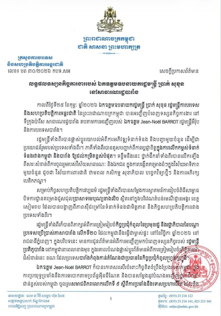 យោងតាមសេចក្តីប្រកាសព័ត៌មានរបស់ក្រសួងការបរទេស និងសហប្រតិបត្តិការអន្តរជាតិ នៅថ្ងៃទី៣ ខែមីនា ឆ្នាំ២០២៦ បានឱ្យដឹងថា ដំណើរបំពេញទស្សនកិច្ចការងាររបស់ឯកឧត្តមឧបនាយករដ្ឋមន្ត្រី ប្រាក់ សុខុន រដ្ឋមន្ត្រីការបរទេស និងសហប្រតិបត្តិការអន្តរជាតិកម្ពុជា នៅទីក្រុងប៉ារីស សាធារណៈរដ្ឋបារាំង កាលពីថ្ងៃទី២៥ ខែកុម្ភៈ ឆ្នាំ២០២៦ គឺទទួលបានលទ្ធផលផ្លែផ្កាល្អគួរជាទីមោទន។