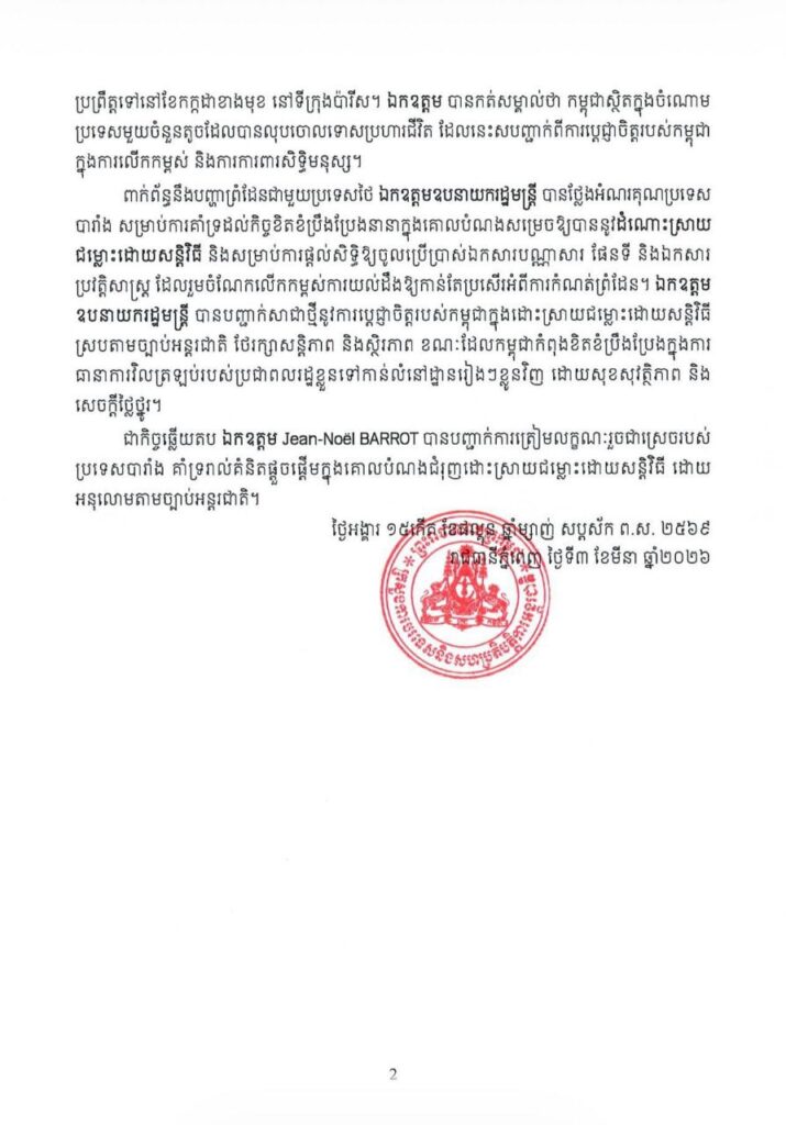 ជាមួយគ្នានោះផងដែរ ឯកឧត្តមឧបនាយករដ្ឋមន្ត្រី ក៏បានថ្លែងអំណរគុណប្រទេសបារាំង សម្រាប់ការគាំទ្រដល់កិច្ចខិតខំប្រឹងប្រែងនានាក្នុងគោលបំណងសម្រេចឱ្យបាននូវដំណោះស្រាយជម្លោះដោយសន្តិវិធី និងសម្រាប់ការផ្តល់សិទ្ធិឱ្យចូលប្រើប្រាស់ឯកសារបណ្ណាសារ ផែនទី និងឯកសារ ប្រវត្តិសាស្ត្រ ដែលរួមចំណែកលើកកម្ពស់ការយល់ដឹងឱ្យកាន់តែប្រសើរអំពីការកំណត់ព្រំដែន។ ទន្ទឹមនោះផងដែរ ឯកឧត្តម Jean-Noël BARROT ក៏បានឆ្លើយបតបញ្ជាក់វិញថា ប្រទេសបារាំងបានត្រៀមលក្ខណៈរួចជាស្រេចក្នុងគាំទ្ររាល់គំនិតផ្តួចផ្តើមរបស់កម្ពុជា ក្នុងគោលបំណងជំរុញដោះស្រាយជម្លោះដោយសន្តិវិធីដោយអនុលោមតាមច្បាប់អន្តរជាតិ៕