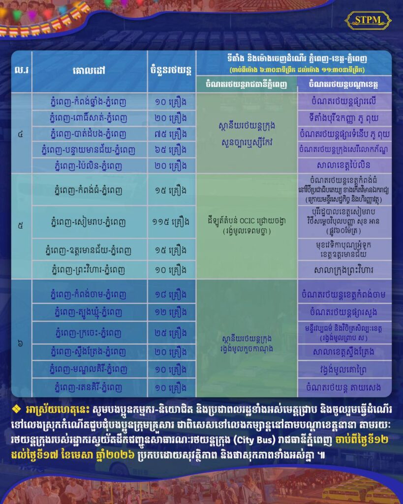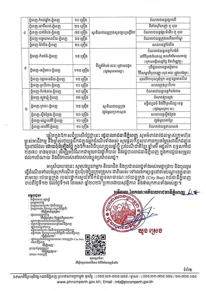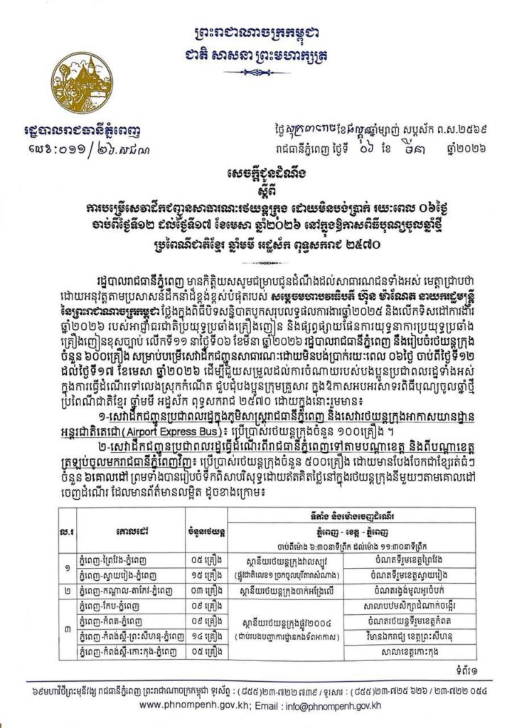 អាស្រ័យហេតុនេះ សូមបងប្អូនកម្មករ-និយោជិតនិងប្រជាពលរដ្ឋទាំងអស់មេត្តជ្រាបនិងចូលរួមធ្វើដំណើរទៅលេងស្រុកកំណើតជួបជុំបងប្អូនក្រុមគ្រួសារជាពិសេសទៅលេងកម្សាន្តនៅតាមបណ្ដាខេត្តនានាតាមរយៈរថយន្តក្រុងរបស់រដ្ឋាករស្វយ័តដឹកជញ្ជូនសាធារណៈរថយន្តក្រុង (City Bus) រាជធានីភ្នំពេញ ចាប់ពីថ្ងៃទី១២ ដល់ថ្ងៃទី១៧ ខែមេសា ឆ្នាំ២០២៦ ប្រកបដោយសុវត្ថិភាព និងផាសុកភាពទាំងអស់គ្នា៕