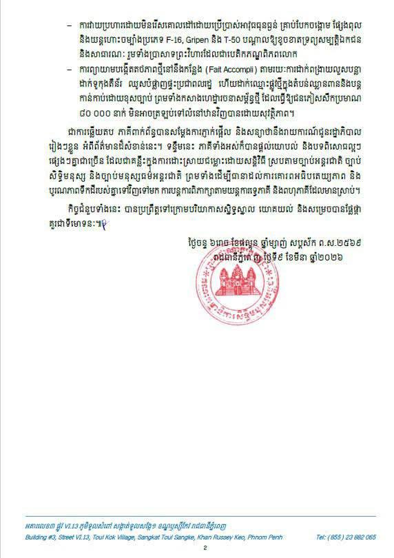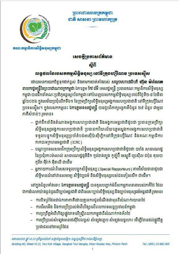 យោងតាមសេចក្តីប្រកាសព័ត៌មានរបស់គណៈកម្មាធិការសិទ្ធិមនុស្សកម្ពុជាស្តីពីលទ្ធផលនៃបេសកកម្មសិទ្ធិមនុស្ស នៅទីក្រុងហ្សឺណែវ ប្រទេសស្វីសចុះថ្ងៃទី៩ ខែមីនា ឆ្នាំ២០២៦ បានឱ្យដឹងថា នៅក្នុងជំនួបទ្វេភាគីចំនួន ២៩ ក្នុងឱកាសបំពេញបេសកកម្មសិទ្ធិមនុស្ស ឯកឧត្តម កែវ រ៉េមី ទេសរដ្ឋមន្រ្តី ប្រធានគណៈកម្មាធិការសិទ្ធិមនុស្សកម្ពុជា បានគូសបញ្ជាក់អំពីសកម្មភាពនានារបស់ភាគីថៃ ដែល ជាការរំលោភយ៉ាងធ្ងន់ធ្ងរលើច្បាប់អន្តរជាតិ ជាពិសេស ច្បាប់សិទ្ធិមនុស្ស និងច្បាប់មនុស្សធម៌អន្តរជាតិរួមមាន៖ការបិទព្រំដែនជាឯកតោភាគីដោយគ្មានការជូនដំណឹងជាមុនពីសំណាក់យោធាថៃ, ការរើសអើង និងការប្រើប្រាស់អំពើហិង្សាលើពលករទេសន្តប្រវេសន៍កម្ពុជា, ការប្រព្រឹត្តអំពើហិង្សាផ្លូវភេទលើស្ត្រីពលករកម្ពុជាពីសំណាក់កងទ័ពថៃ, ការប្រើប្រាស់សំឡេងមានដេស៊ីបែលខ្ពស់ សំឡេងខ្មោច សំឡេងយន្តហោះ ដើម្បីរំខានដល់ផ្លូវចិត្ត ប្រជាជននៅតាមព្រំដែន, ការវាយប្រហារដោយមិនរើសគោលដៅដោយប្រើប្រាស់អាវុធធុនធ្ងន់ គ្រាប់បែកចង្កោម ផ្សែងពុល និងយន្តហោះចម្បាំងប្រភេទ F-16, Gripen និង T-50 បណ្តាលឱ្យខូចខាតទ្រព្យសម្បត្តិឯកជន និងសាធារណៈ រួមទាំងប្រាសាទព្រះវិហារដែលជាបេតិកភណ្ឌពិភពលោក, ការព្យាយាមបង្កើតតថភាពថ្មីនៅនឹងកន្លែង (Fait Accompli) តាមរយៈការដាក់ពង្រាយលួសបន្លា ដាក់ទូកុងតឺន័រ ឈូសបំផ្លាញផ្ទះប្រជាពលរដ្ឋ ហើយដាក់ឈ្មោះផ្លូវថ្មីក្នុងតំបន់ឈ្លានពាននិងបន្ត កាន់កាប់ដោយខុសច្បាប់ ព្រមទាំងកសាងហេដ្ឋារចនាសម្ព័ន្ធថ្មី ដែលធ្វើឱ្យជនភៀសសឹកប្រមាណ ៨០ ០០០ នាក់ មិនអាចត្រឡប់ទៅលំនៅឋានវិញបានដោយសុវត្ថិភាព។