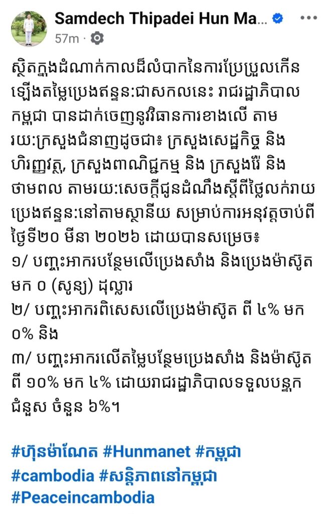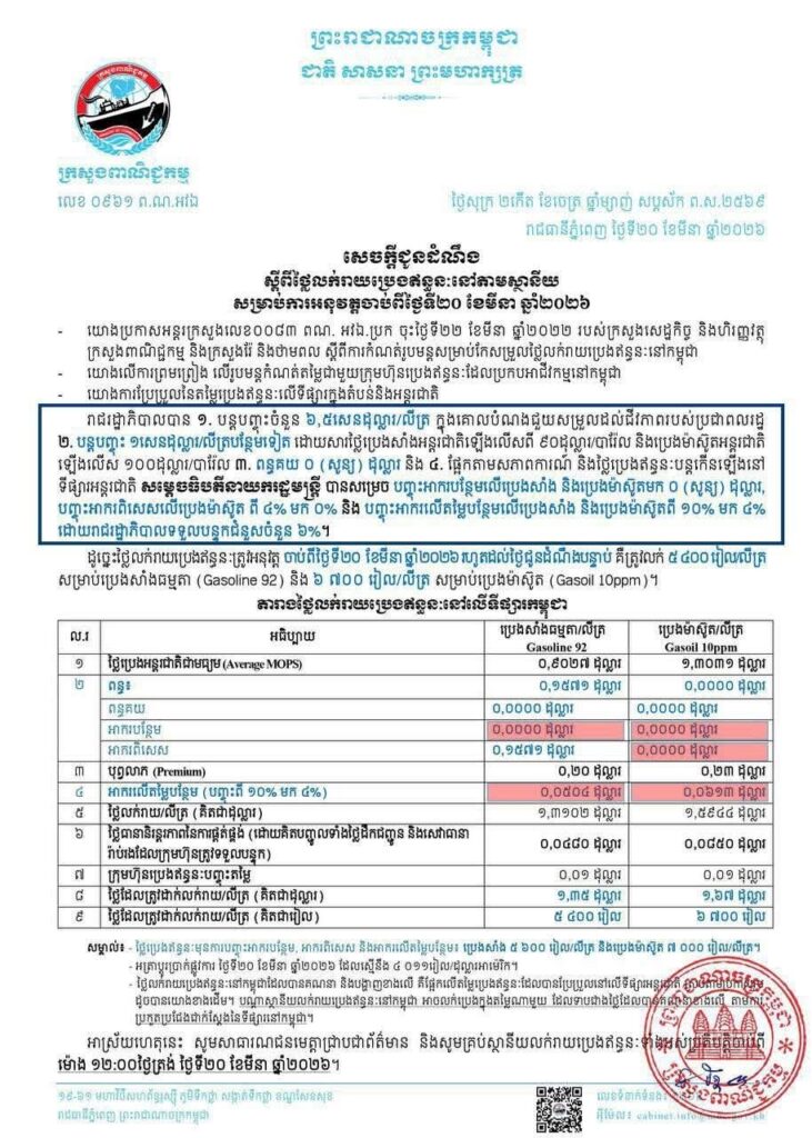 យោងតាមការបង្ហោះផ្សាយនៅក្នុងបណ្ដាញសង្គមរបស់សម្ដេចធិបតី ហ៊ុន ម៉ាណែត នាយករដ្ឋមន្ត្រីនៃព្រះរាជាណាចក្រកម្ពុជានៅថ្ងៃទី២១ ខែមីនា ឆ្នាំ២០២៦ បានឱ្យដឹងថា ស្ថិតក្នុងដំណាក់កាលដ៏លំបាកនៃការប្រែប្រួលកេីនឡេីងតម្លៃប្រេងឥន្ទន:ជាសកលនេះ រាជរដ្ឋាភិបាលកម្ពុជា បានដាក់ចេញនូវវិធានការខាងលេី តាមរយ:ក្រសួងជំនាញដូចជា៖ ក្រសួងសេដ្ឋកិច្ច និងហិរញ្ញវត្ថុ, ក្រសួងពាណិជ្ជកម្ម និង ក្រសួងរ៉ែ និងថាមពល តាមរយ:សេចក្តីជូនដំណឹងស្តីពីថ្លៃលក់រាយប្រេងឥន្ទន:នៅតាមស្ថានីយ សម្រាប់ការអនុវត្តចាប់ពីថ្ងៃទី២០ មីនា ២០២៦ ដោយបានសម្រេច៖