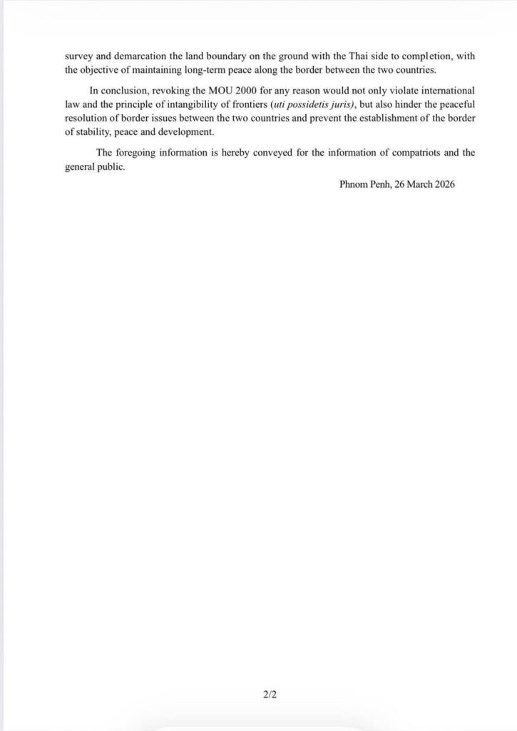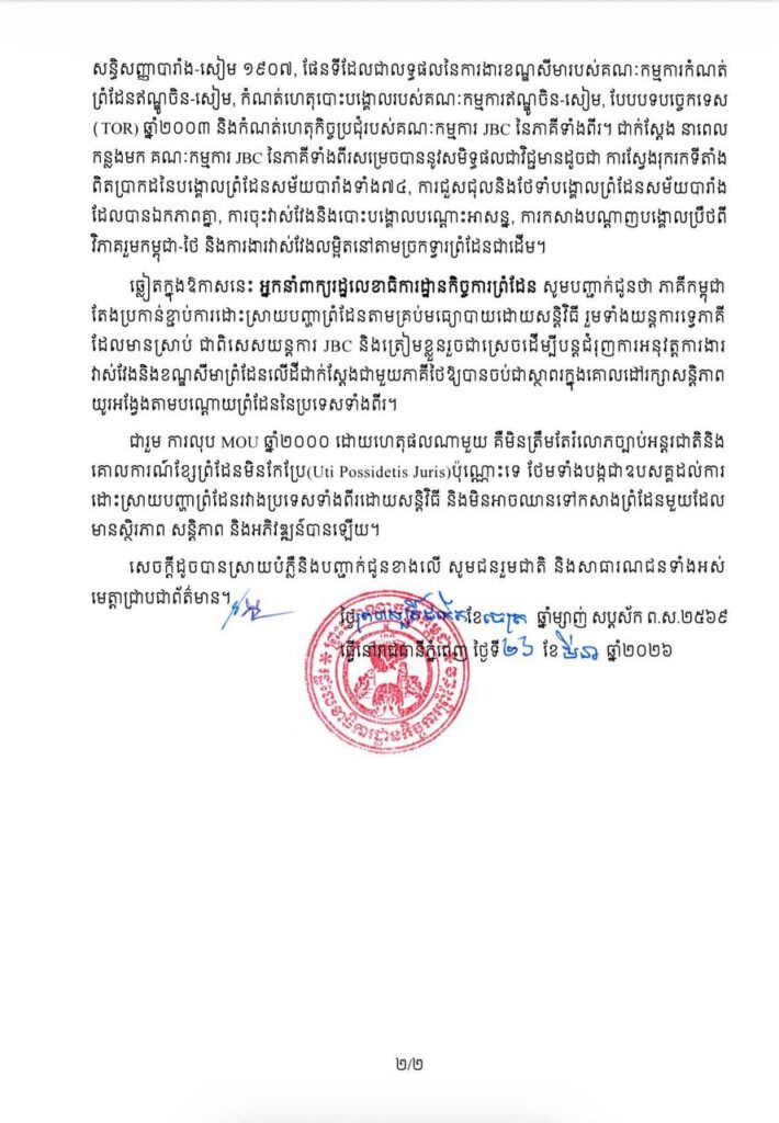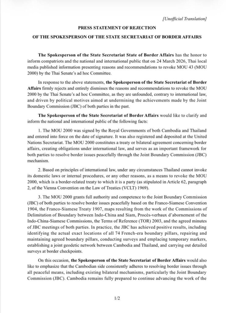 យោងតាមសេចក្តីប្រកាសបដិសេធព័ត៌មានរបស់អ្នកនាំពាក្យរដ្ឋលេខាធិការដ្ឋានកិច្ចការព្រំដែននៅថ្ងៃទី២៦ ខែមីនា ឆ្នាំ២០២៦ បានឱ្យដឹងថា កាលពីថ្ងៃទី២៤ ខែមីនា ឆ្នាំ២០២៦ សារព័ត៌មានក្នុងស្រុកថៃ បានផ្សព្វផ្សាយព័ត៌មានដែលបានលើកអំពីហេតុផលនិងអនុសាសន៍ស្នើលុប MOU ៤៣ (MOU ឆ្នាំ ២០០០) របស់គណៈកម្មាធិការចំពោះកិច្ចព្រឹទ្ធសភាថៃ។