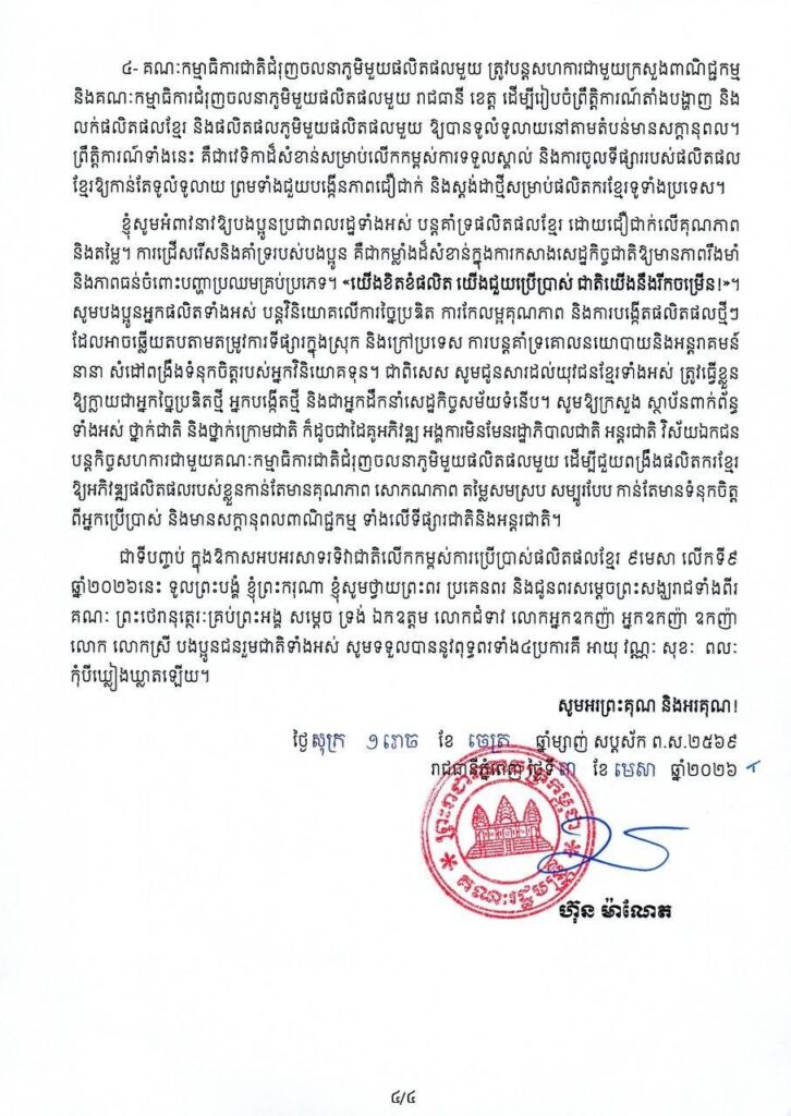ក្នុងសារលិខិត ចុះថ្ងៃទី៣ ខែមេសា ឆ្នាំ២០២៦ ទិវាជាតិលើកម្ពស់ផលិតផលខ្មែរ នឹងត្រូវធ្វើឡើងក្រោមប្រធានបទ «ខ្មែរផលិត ខ្មែរប្រើប្រាស់ ខ្មែររីកចម្រើន» សម្តេចធិបតី បានបញ្ជាក់ថា ក្រោយសង្គ្រាម និងការបែកបាក់ជាតិអស់ជាច្រើនទសវត្សរ៍ កម្ពុជាបានចាប់ផ្តើមដំណើរស្តារឡើងវិញ ក្រោមការដឹកនាំដ៏ឈ្លាសវៃ និងភាពប៉ិនប្រសប់របស់ សម្តេចតេជោ ហ៊ុន សែន បានដាក់ចេញនូវការប្តេជ្ញាចរចាសន្តិភាព ធ្វើឱ្យមាននូវកិច្ចព្រមព្រៀង នយោបាយ និងការរួបរួមជាតិ ជាពិសេសបាននាំមកនូវការត្រឡប់ឡើងវិញនៃ «ព្រះរាជាណាចក្រកម្ពុជា» ជាលើកទី២ ក្រោយពីត្រូវបានលុបបំបាត់ដោយរបបកម្ពុជាប្រជាធិបតេយ្យ ក្រោមបាវចនា «ជាតិ សាសនា ព្រះមហាក្សត្រ» ដែលបច្ចុប្បន្នមាន ព្រះករុណាព្រះបាទសម្តេចព្រះបរមនាថ នរោត្តម សីហមុនី ព្រះមហាក្សត្រនៃព្រះរាជាណាចក្រកម្ពុជា ជាទីគោរពសក្ការៈដ៏ខ្ពង់ខ្ពស់បំផុត កំពុងគង់ប្រថាប់ជាព្រះស្វេតច្ឆត្រ ដ៏ត្រជាក់ត្រជំ និងកក់ក្តៅសម្រាប់ប្រជាពលរដ្ឋកម្ពុជាគ្រប់រូប។ ជាមួយគ្នានោះ គោលនយោបាយ «ឈ្នះ ឈ្នះ» របស់ សម្តេចតេជោ ដែលផ្តល់អាទិភាពដល់ការអត់ឱន ការធានាសុវត្ថិភាព និងការរួមបញ្ចូលគ្នា បានធ្វើឱ្យ កម្ពុជាបញ្ចប់សង្គ្រាមស៊ីវិលជាផ្លូវការ និងក្លាយជាចំណុចប្រវត្តិសាស្ត្រដ៏សំខាន់ដែលបានបើកផ្លូវឱ្យកម្ពុជាចូលទៅ កាន់សករាជថ្មីនៃសន្តិភាពនិងការអភិវឌ្ឍ។