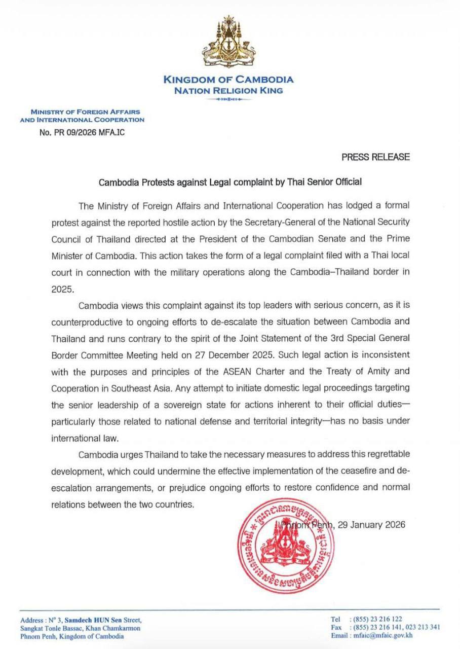 យោងតាមសេចក្តីប្រកាសព័ត៌មានរបស់ក្រសួងការបរទេស និងសហប្រតិបត្តិការអន្តរជាតិនៅថ្ងៃទី២៩ ខែមករា ឆ្នាំ២០២៦ បានឲ្យដឹងថាក្រសួងការបរទេស និងសហប្រតិបត្តិការអន្តរជាតិ បានធ្វើការតវ៉ាជំទាស់ជាផ្លូវការចំពោះ សកម្មភាពអរិភាពរបស់អគ្គលេខាធិការនៃក្រុមប្រឹក្សាសន្តិសុខជាតិថៃ មកលើប្រធានព្រឹទ្ធសភាកម្ពុជា