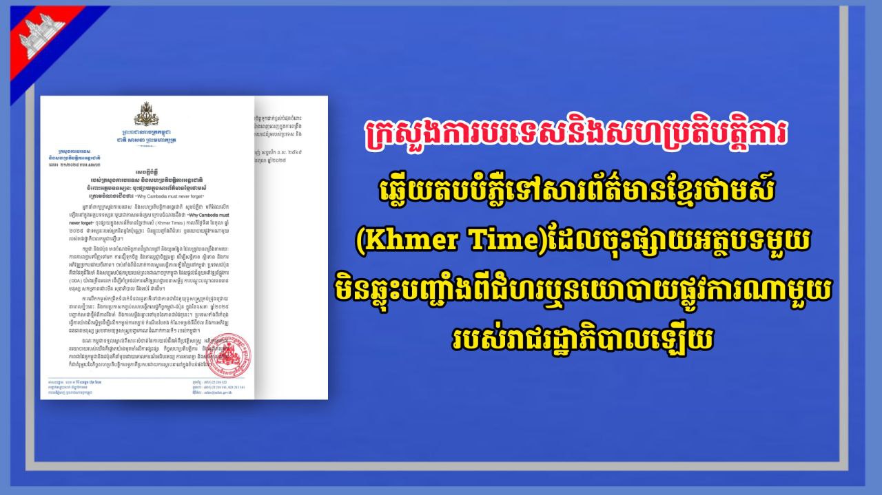 ក្រសួងការបរទេសនិងសហប្រតិបត្តិការ ឆ្លើយតបបំភ្លឺទៅសារព័ត៌មានខ្មែរថាមស៍(Khmer Time) ដែលចុះផ្សាយអត្ថបទមួយមិនឆ្លុះបញ្ជាំងពីជំហរ ឬនយោបាយផ្លូវការណាមួយរបស់រាជរដ្ឋាភិបាលឡើយ