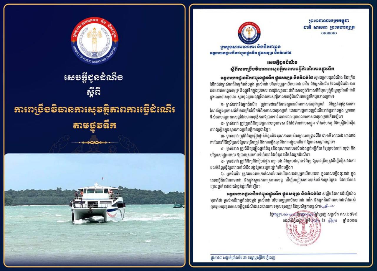 ក្រសួងសាធារណការ ប្រកាសអោយម្ចាស់អាជីវកម្មទូកចម្លង និងផ្លូវសមុទ្រ ត្រូវពង្រឹងសុវត្ថិភាពអ្នកដំណើរតាមផ្លូវទឹក ភ្នំពេញ ៖ ក្រសួងសាធារណការ បានជូនដំណឹង នៅថ្ងៃទី២៦សីហានេះថា ដើម្បីពង្រឹងសុវត្ថិភាព ម្ចាស់នាវា និងអ្នកដំណើរ ត្រូវតាមដានព័ត៌មានព្យាករអាកាសធាតុជាប្រចាំ ហើយត្រូវអនុវត្តតាមការណែនាំ ដូចជាការផ្អាកចេញដំណើរនាវា នាវាចម្លង ឬរកទីសំចតបណ្តោះអាសន្នដែលមានសុវត្ថិភាពឱ្យបានទាន់ពេលវេលា មុនពេលអាកាសធាតុអាក្រក់កើតឡើង។ ម្ចាស់នាវា ក៏ត្រូវត្រួតពិនិត្យលក្ខណៈបច្ចេកទេស និងថែទាំនាវាខ្លួន ទាំងសំបកតួ និងគ្រឿងម៉ាស៊ីន ឱ្យស្ថិតក្នុងស្ថានភាពប្រតិបត្តិការល្អជានិច្ច។ នៅក្នុងសេចក្តីជូនដំណឹងនោះបន្តថា ម្ចាស់នាវាត្រូវពិនិត្យគុណភាពរបស់សម្ភារៈសង្គ្រោះជីវិតដូចជា អាវពោង ពោងកង ព្រមទាំងណែនាំពីវិធីប្រើប្រាស់ឱ្យបានត្រឹមត្រូវដល់អ្នកដំណើរ។ ម៉្យាងវិញទៀត ត្រូវពិនិត្យ គុណភាពបំពង់ពន្លត់អគ្គិភ័យ ខ្សែពួរចងនាវា យុថ្កា និងបរិក្ខារសង្គ្រោះបឋមឱ្យស្របតាមទំហំនាវានឹងចំនួននាវិក ព្រមទាំងអ្នកដំណើរ។ ជៀសវាងការទុក្ខដាក់ទំនិញមិនបានត្រឹមត្រូវធ្វើឱ្យនាវាបាត់លំនឹង បង្កឱ្យមានគ្រោះថ្នាក់កើតឡើង។ ក្នុងនោះដែរក្រសួងក៏បានរំឭកដល់អ្នកដំណើរត្រូវគោរពតាមការណែនាំនៅពេលឡើង-ចុះនាវា ពេលធ្វើដំណើរ និងក្នុងស្ថានភាពគ្រោះអាសន្ន ដើម្បីបញ្ចៀសភាពបាត់បង់ការគ្រប់គ្រង ដែលនាំមានគ្រោះថ្នាក់នាវាចរណ៍ធ្ងន់ធ្ងរកើតឡើង៕