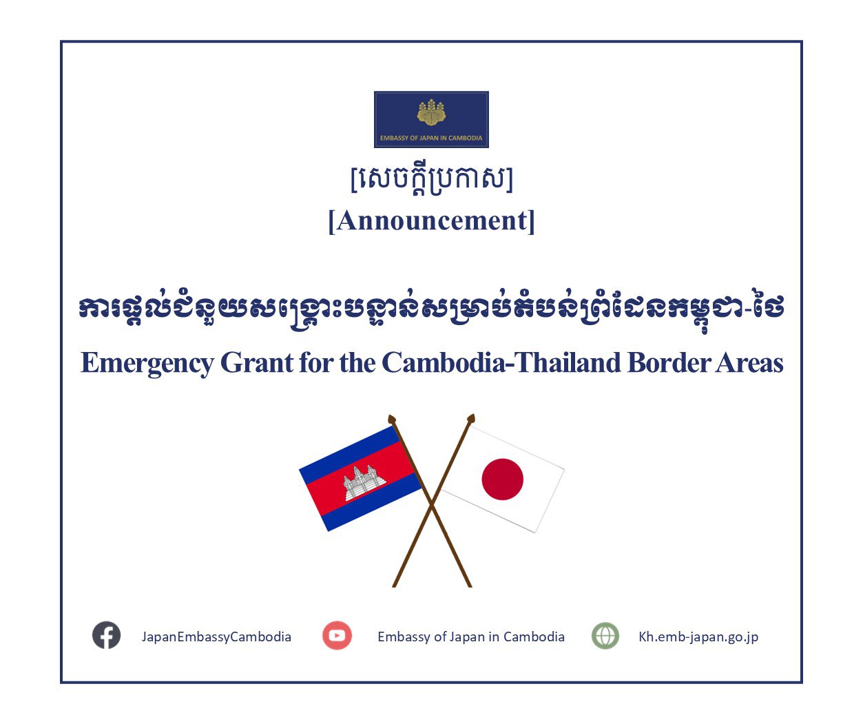 រដ្ឋាភិបាលជប៉ុន សម្រេចផ្តល់ជំនួយសង្គ្រោះបន្ទាន់ (ឥតសំណង) ដែលមានទឹកប្រាក់សរុបប្រមាណ ១,៨លានដុល្លារអាមេរិក ដើម្បីឆ្លើយតបទៅនឹងតម្រូវការមនុស្សធម៌ជាបន្ទាន់នៅតាមតំបន់ព្រំដែនកម្ពុជា-ថៃ