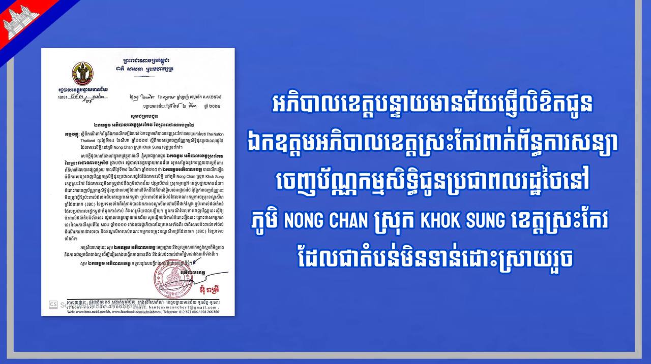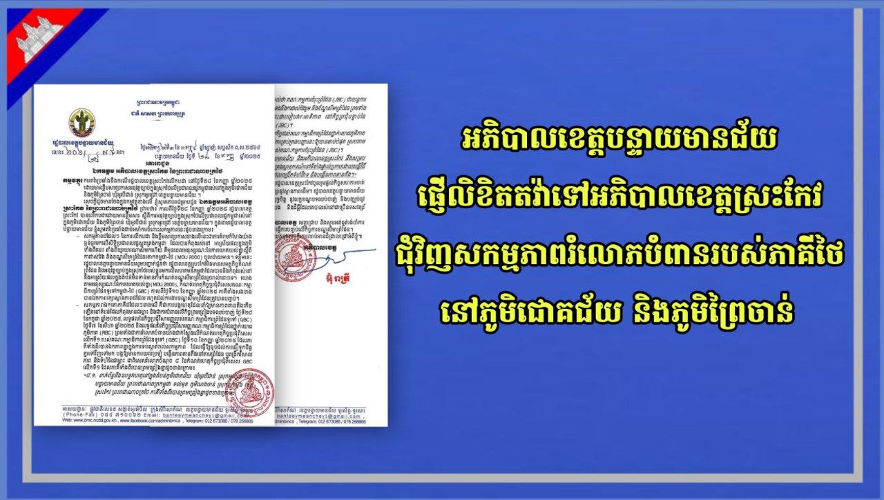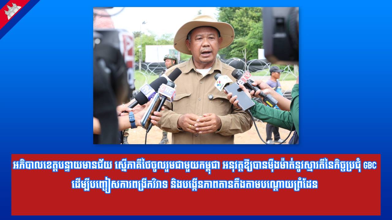 អ្នកនាំពាក្យរដ្ឋបាលខេត្តបន្ទាយមានជ័យ បានចេញសេចក្តីប្រកាសព័ត៌មាន ដោយបានបញ្ជាក់ថា នាថ្ងៃទី១២ ខែវិច្ឆិកា ឆ្នាំ២០២៥ នៅវេលាម៉ោង១៥.៥០នាទី កម្លាំងទាហានថៃ បានប្រើកាំភ្លើង RPD