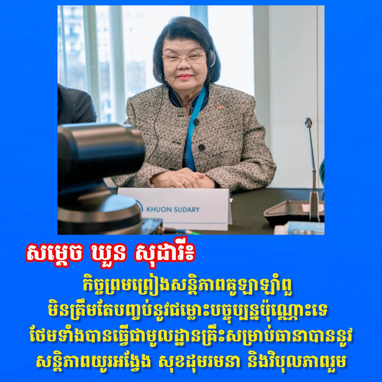 សម្តេច ឃួន សុដារី៖ កិច្ចព្រមព្រៀងសន្តិភាពគូឡាឡាំពួមិនត្រឹមតែបញ្ចប់នូវជម្លោះបច្ចុប្បន្នប៉ុណ្ណោះទេ ថែមទាំងបានធ្វើជាមូលដ្ឋានគ្រឹះសម្រាប់ធានាបាននូវសន្តិភាពយូរអង្វែង សុខដុមរមនា និងវិបុលភាពរួម