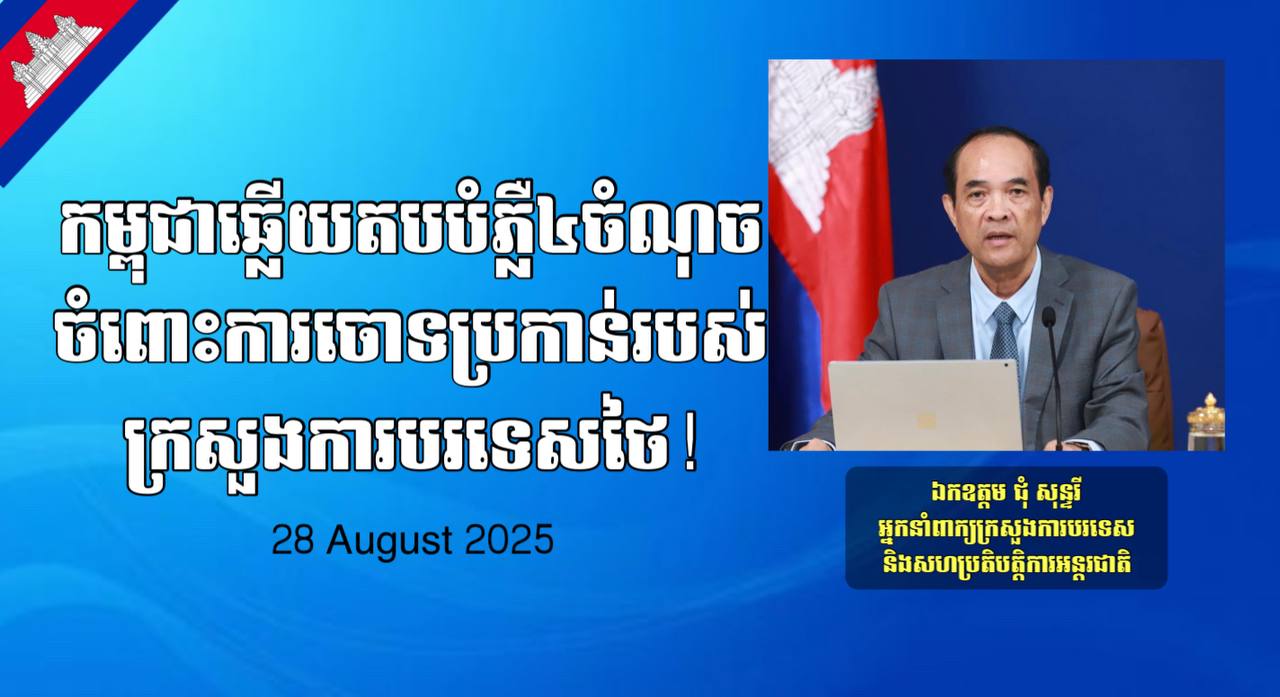 ថ្លែងនៅក្នុងឱកាសធ្វើសេចក្តីសង្ខេបព័ត៌មានប្រចាំថ្ងៃស្ដីពី«លទ្ធផលនៃការអនុវត្តបទឈប់បាញ់រវាងកម្ពុជា-ថៃ» ដែលធ្វើនៅទីស្តីការគណៈរដ្ឋមន្ត្រី នៅរសៀលថ្ងៃទី៣១ ខែសីហា ឆ្នាំ២០២៥ ឯកឧត្តម ជុំ សុន្ទរី អ្នកនាំពាក្យក្រសួងការបរទេស
