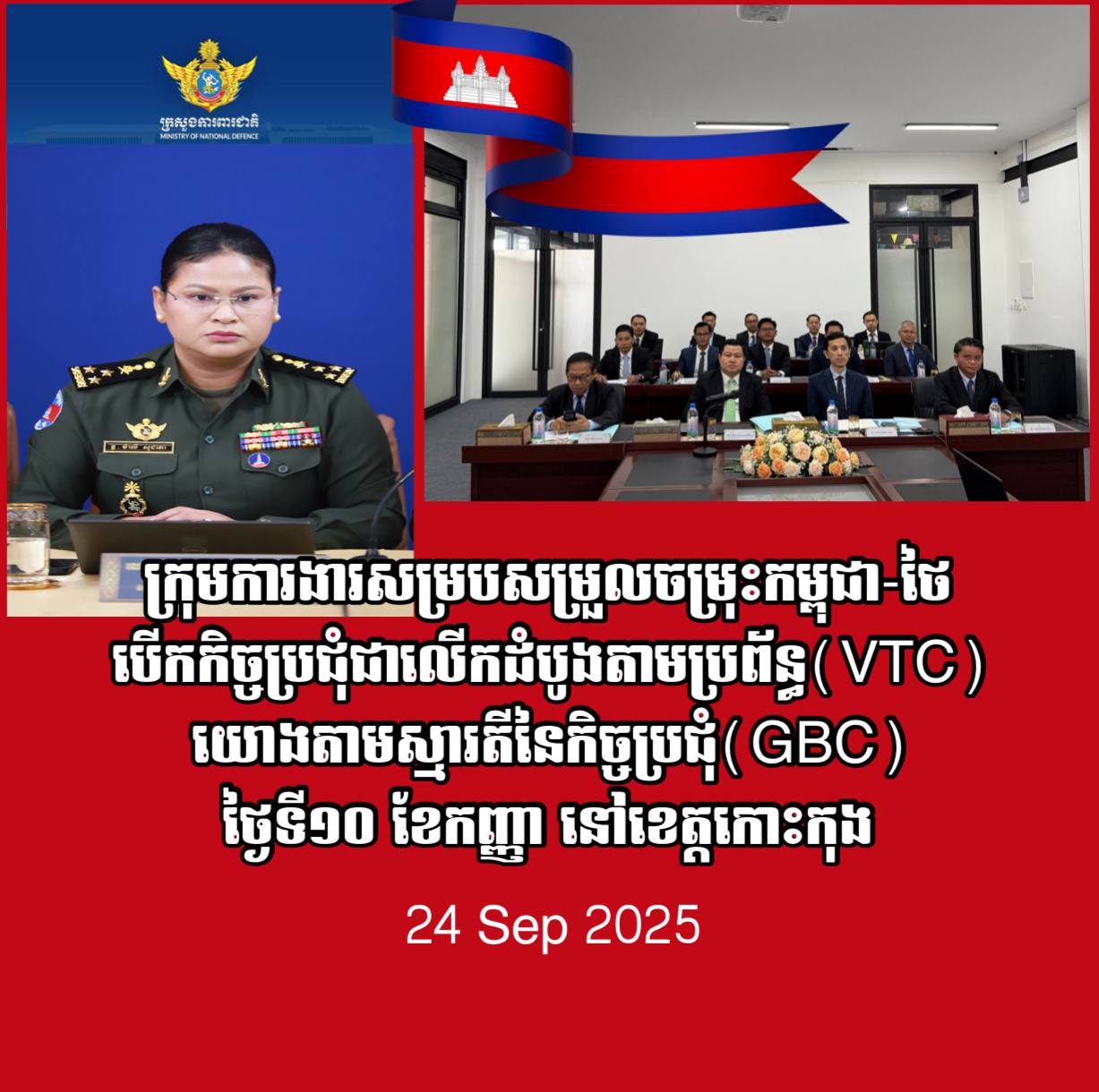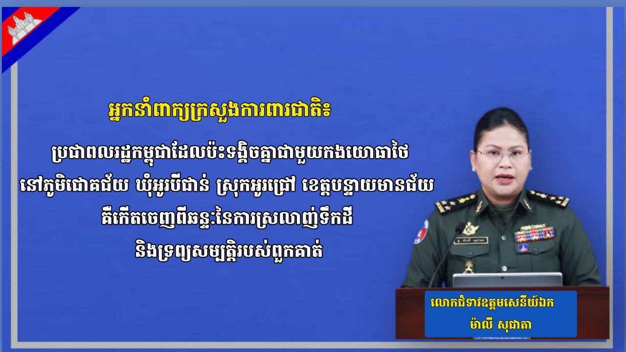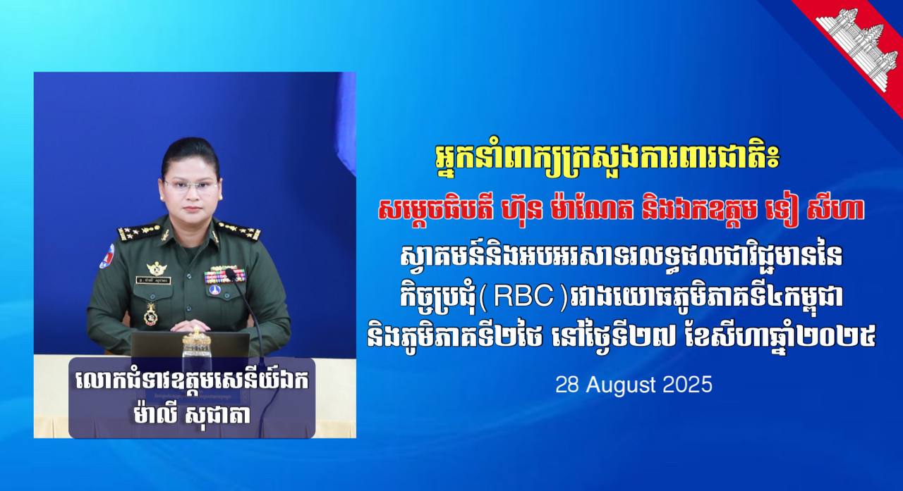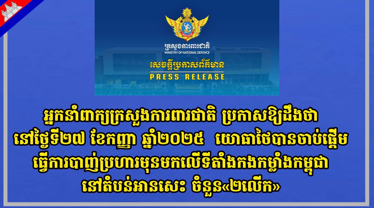យោងតាមការបង្ហោះផ្សាយរបស់ក្រសួងការពារជាតិនៅយប់ថ្ងៃទី២៧ ខែកញ្ញា ឆ្នាំ២០២៥ លោកជំទាវ ឧត្តមសេនីយ៍ឯក ម៉ាលី សុជាតា អ្នកនាំពាក្យក្រសួងការពារជាតិ នៃព្រះរាជាណាចក្រកម្ពុជា បានឱ្យដឹងថា