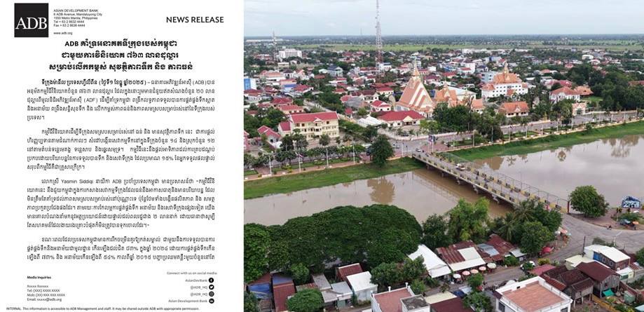 ADB ត្រៀមលុយ ៧៦៣លានដុល្លារជួយកម្ពុជា លើកកម្ពស់សុវត្ថិភាពទឹក និងពង្រឹងភាពធន់