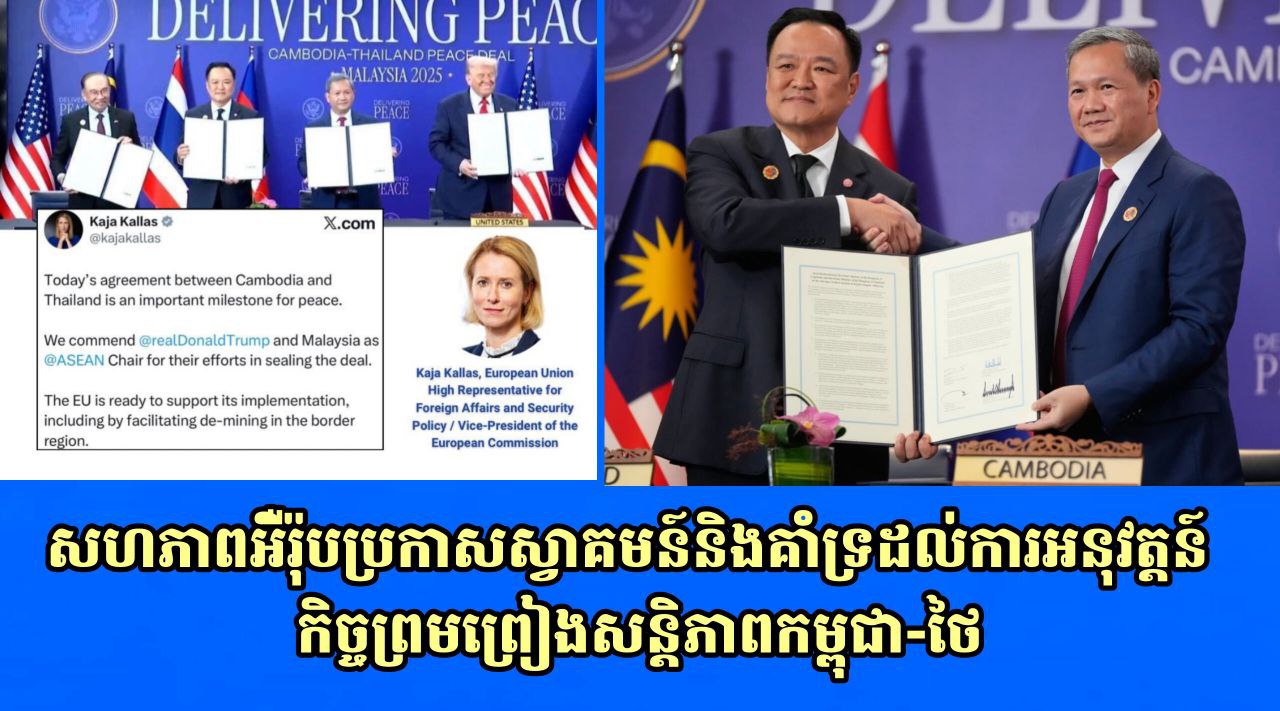សហភាពអឺរ៉ុបប្រកាសស្វាគមន៍និងគាំទ្រដល់ការអនុវត្តន៍កិច្ចព្រមព្រៀងសន្តិភាពកម្ពុជា-ថៃ