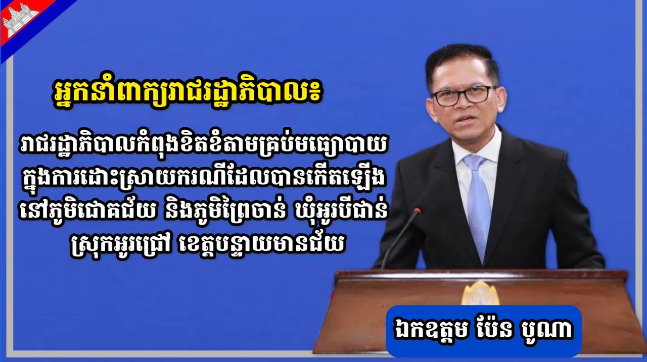 អ្នកនាំពាក្យរាជរដ្ឋាភិបាល៖រាជរដ្ឋាភិបាលកំពុងខិតខំតាមគ្រប់មធ្យោបាយក្នុងការដោះស្រាយករណីដែលបានកើតឡើងនៅភូមិជោគជ័យ និងភូមិព្រៃចាន់ ឃុំអូរបីជាន់ ស្រុកអូរជ្រៅ ខេត្តបន្ទាយមានជ័យ