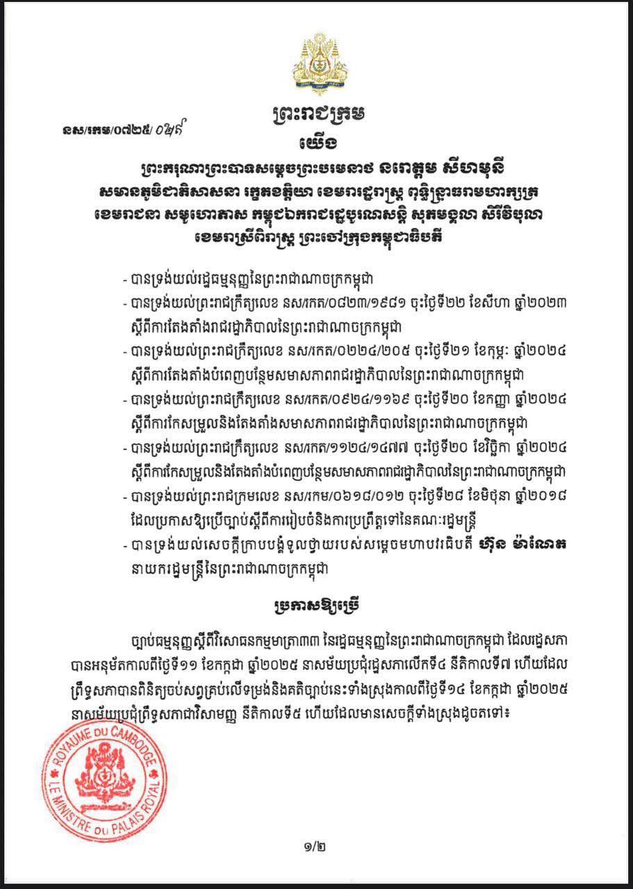 ព្រះមហាក្សត្រចេញព្រះរាជក្រមប្រកាសឱ្យប្រើច្បាប់ធម្មនុញ្ញស្តីពីវិសោធនកម្មមាត្រា ៣៣